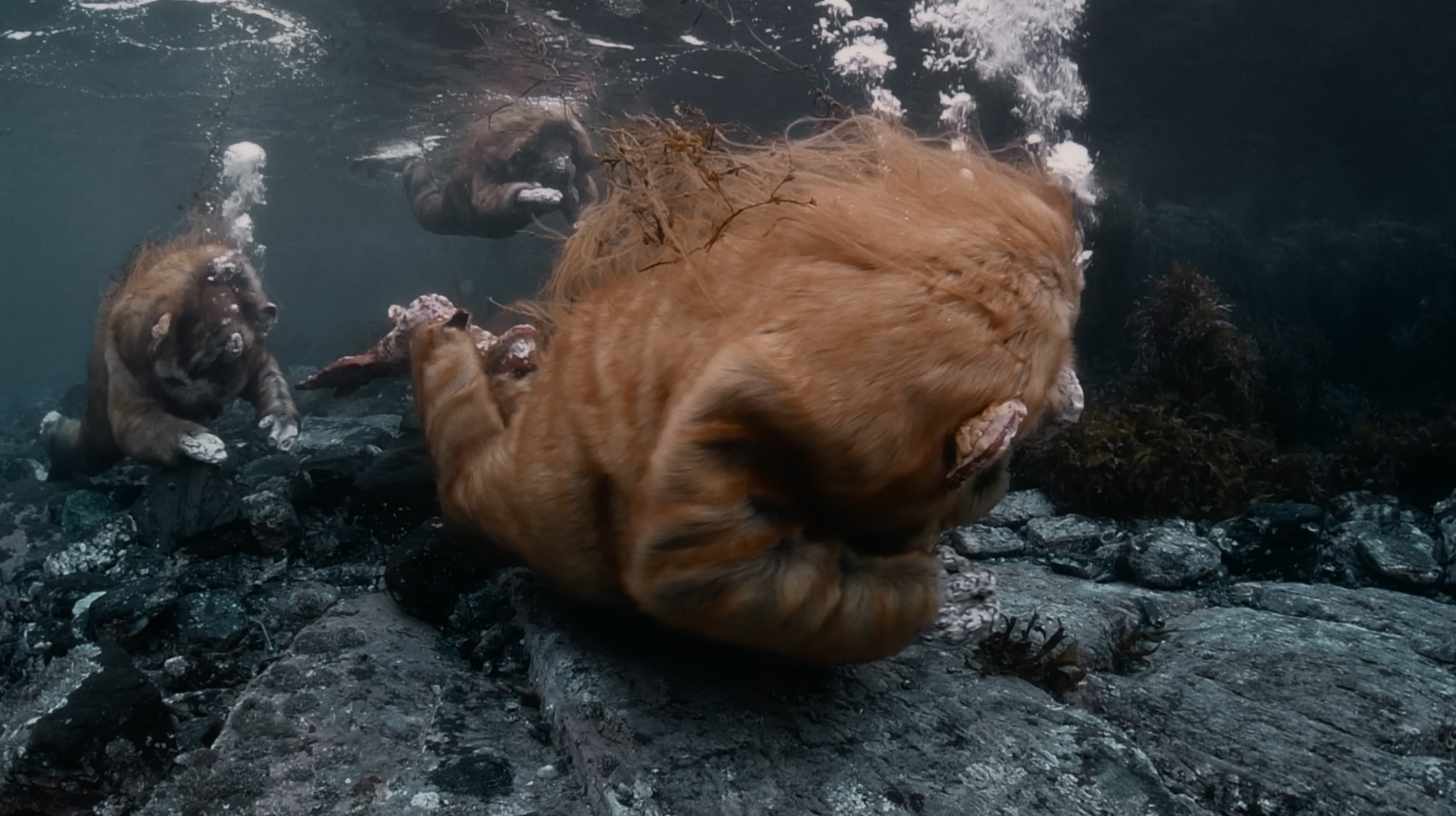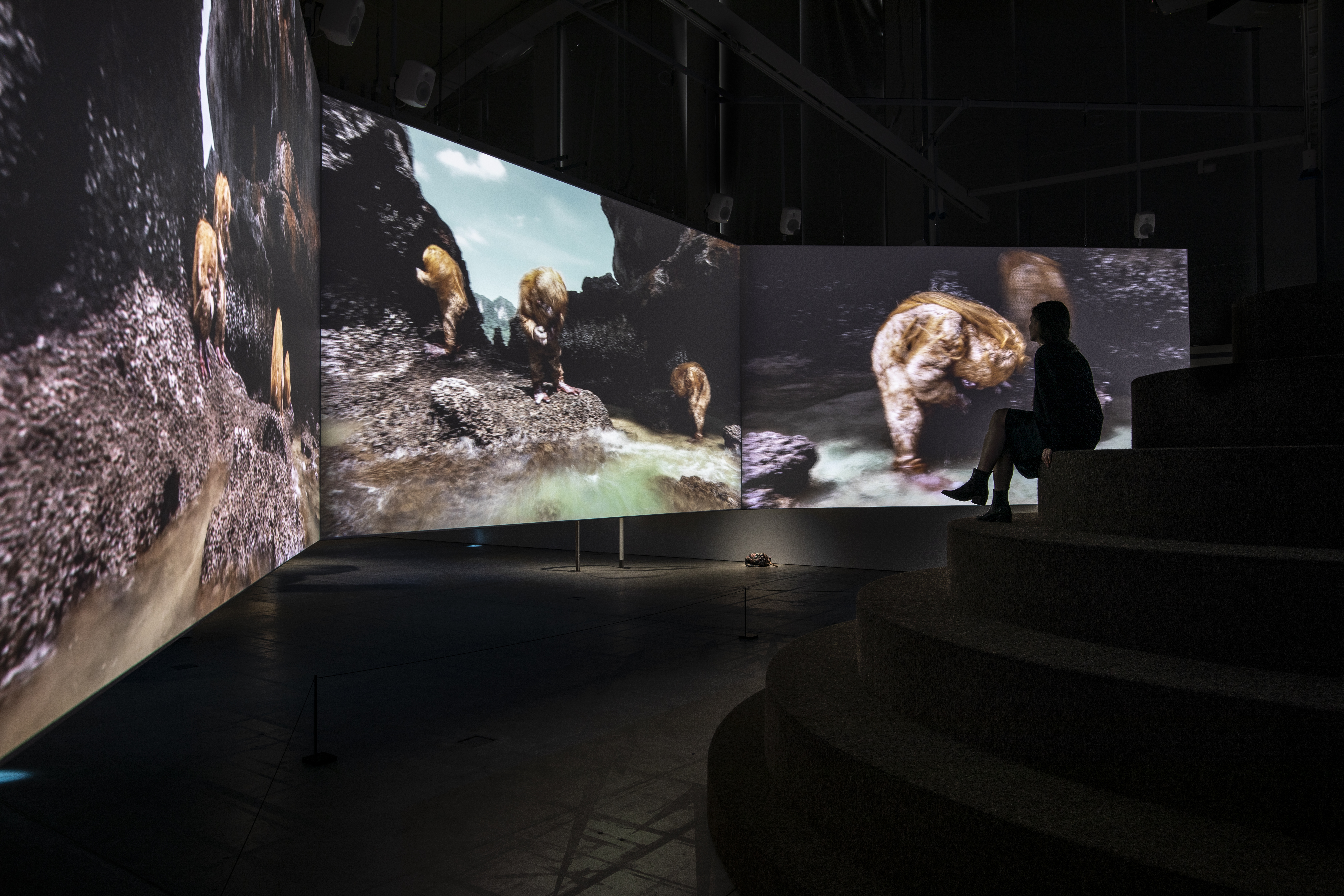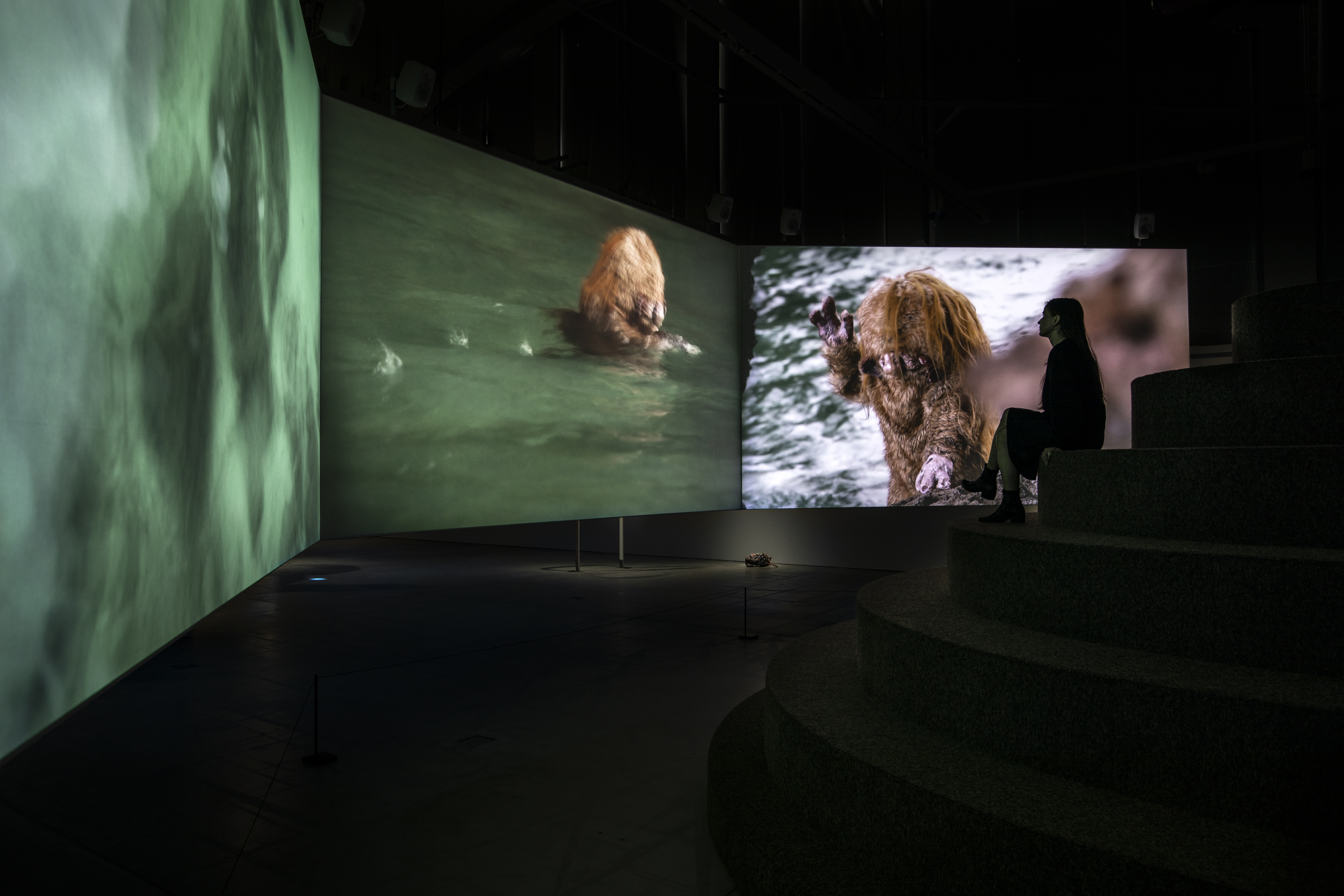 The exhibition’s title piece, BIG WATER (2022), is a large-scale, six-channel sound and video installation depicting ancient or primordial fur-covered creatures diving and playing willow flutes as they move in harmony with the rhythm of the sea on the coast of Thailand and in the arctic waters of northern Norway. The immersive intensity of the piece is heightened by the slowly rotating viewing platform in the centre of the installation.
