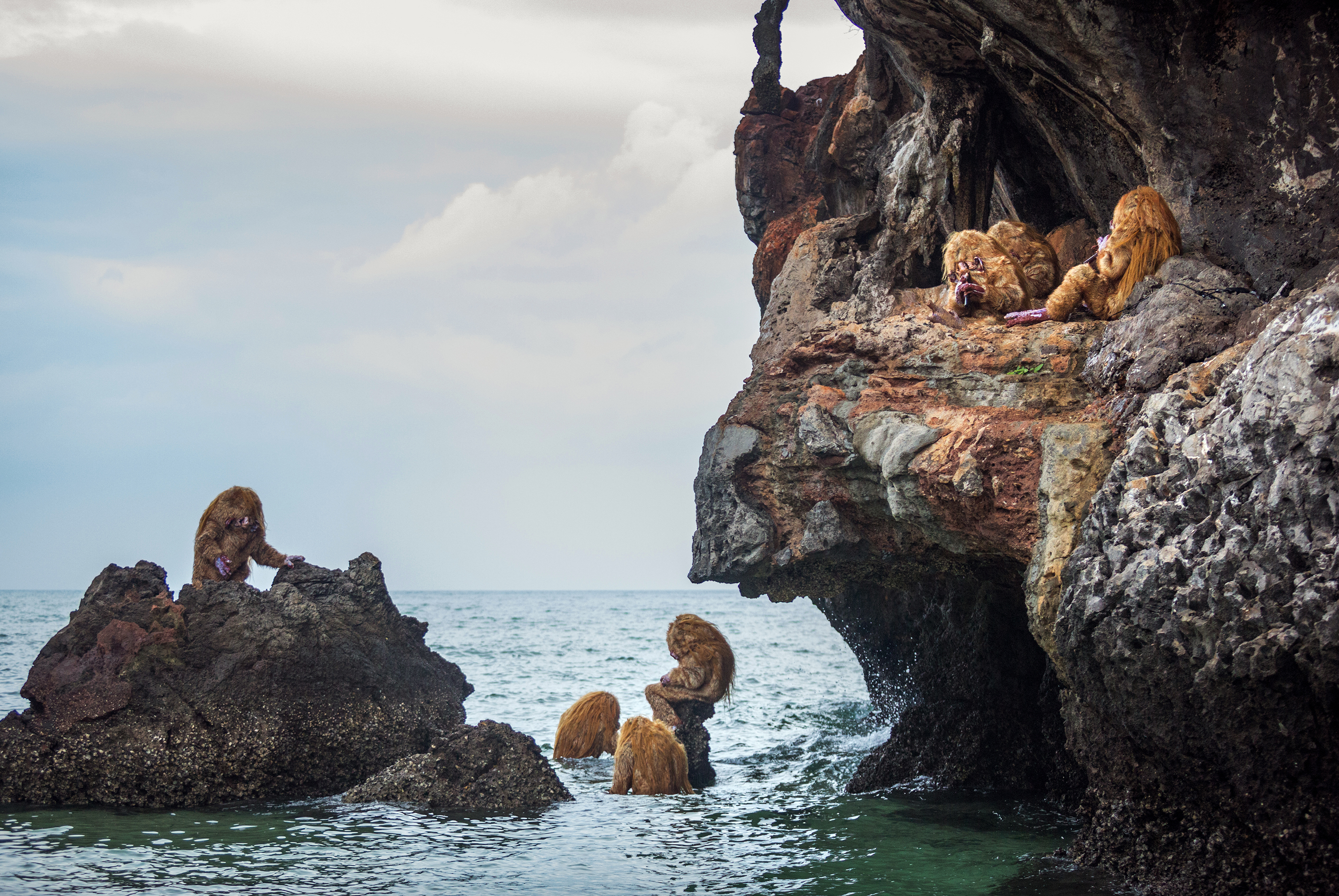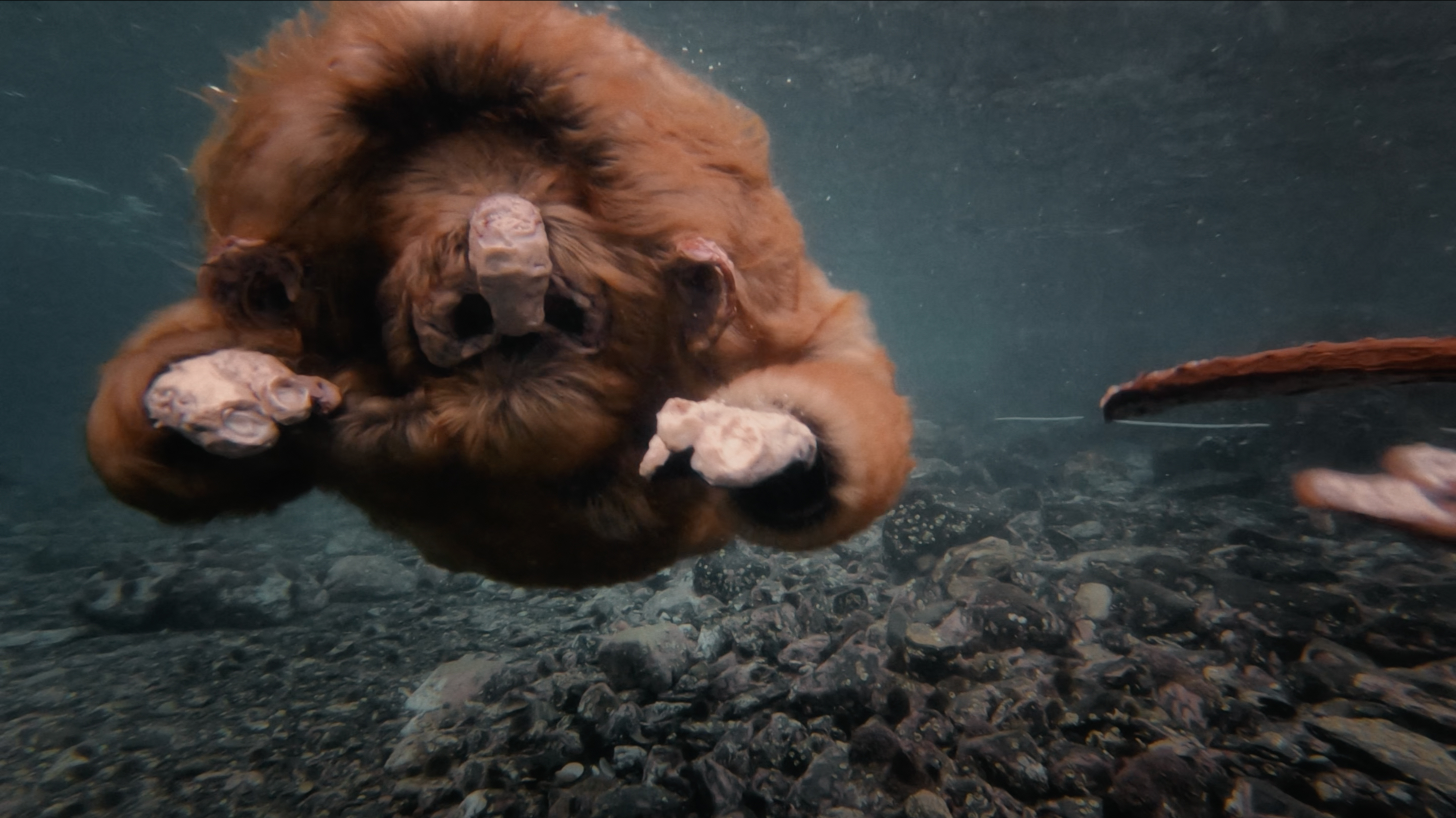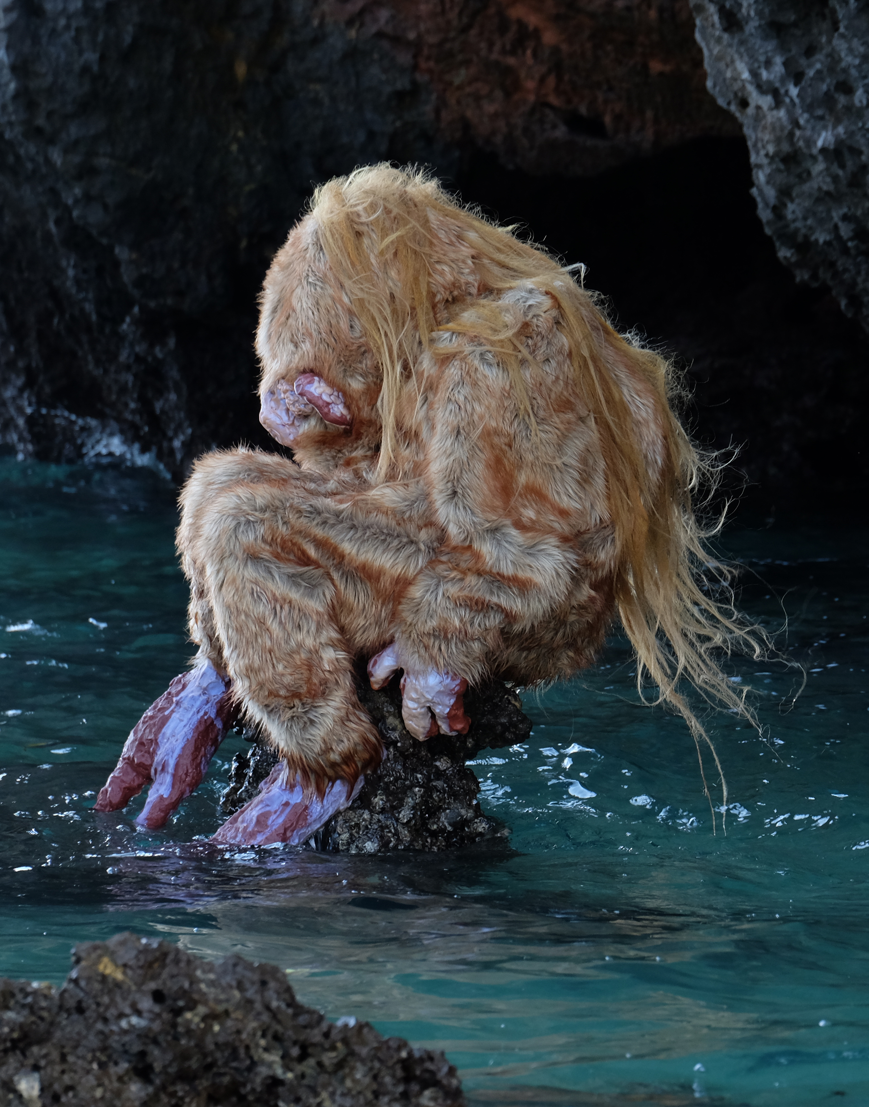 The exhibition’s title piece, BIG WATER (2022), is a large-scale, six-channel sound and video installation depicting ancient or primordial fur-covered creatures diving and playing willow flutes as they move in harmony with the rhythm of the sea on the coast of Thailand and in the arctic waters of northern Norway. The immersive intensity of the piece is heightened by the slowly rotating viewing platform in the centre of the installation.