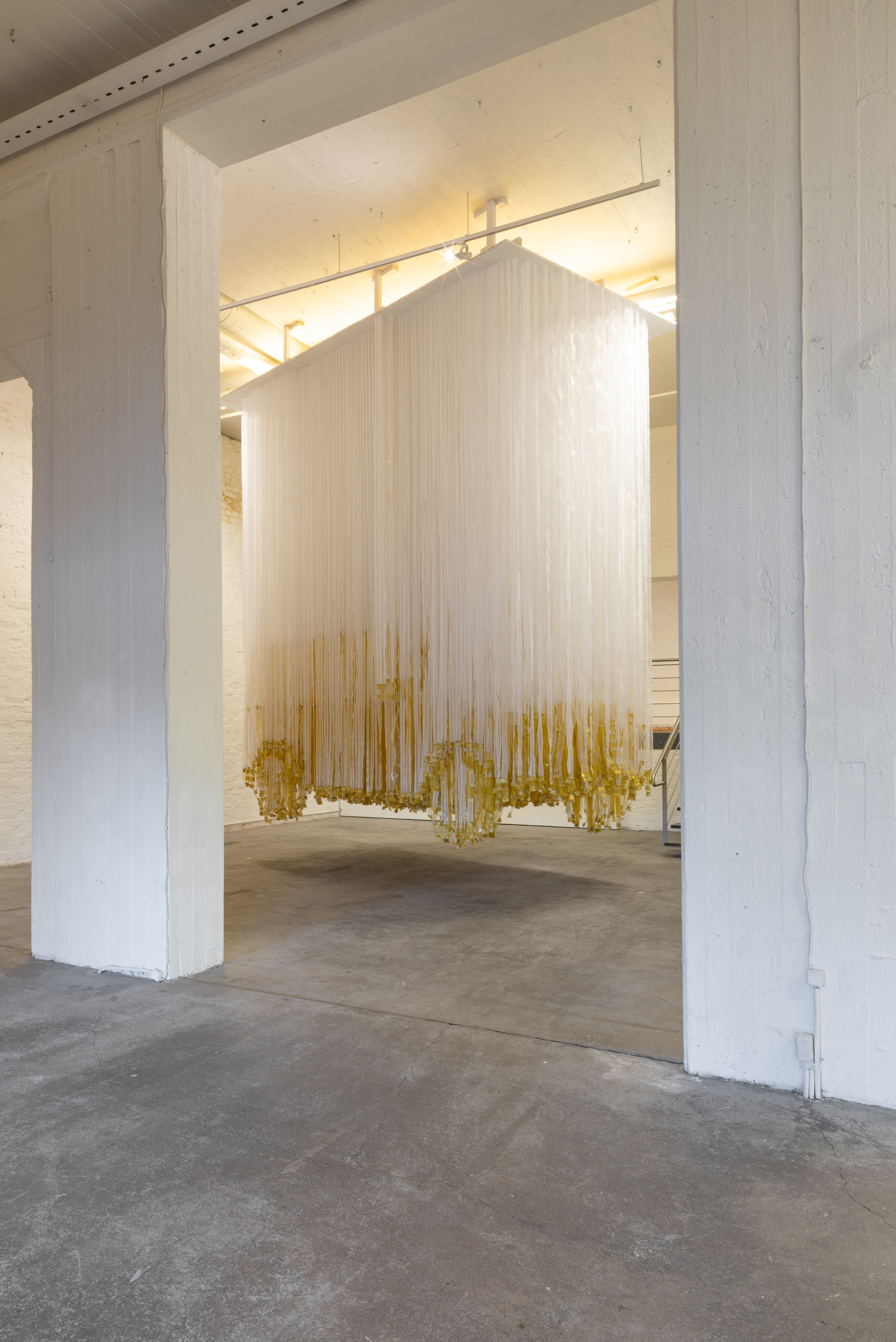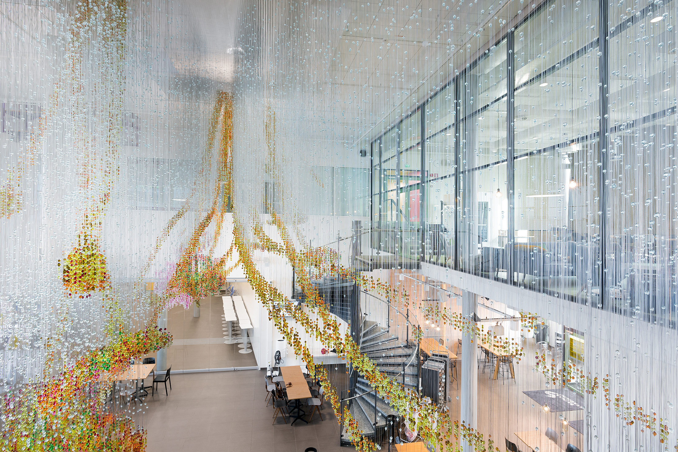 Kuvanveistäjä Hanna Vihriälän teosten kantava voima on materiaalin tuntu. Hän käyttää niiden valmistamiseen epätavallisia materiaaleja kuten irtomakeisia, soraa ja akryylihelmiä, hän pujottaa teräslankoihin valtaviksi riippuviksi ja ilmaviksi teoksiksi. Valmistus on vaativaa käsityötä: yhdessä teoksessa voi olla jopa 350 000 akryylihelmeä, joista muodostuu tiivis, mutta eloisa pinta. Teoksille on luonteenomaista vastakohtien välinen jännite: kestävä ja hauras, kova ja pehmeä.