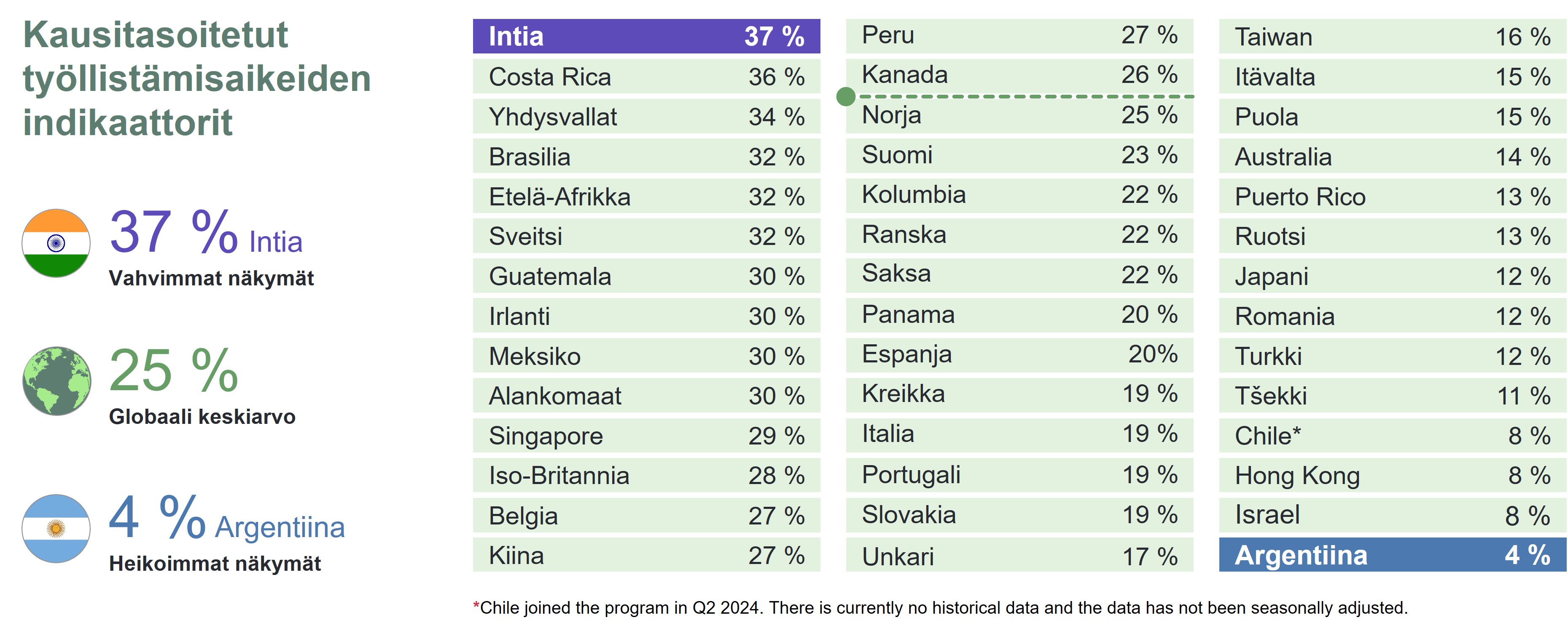 Työnantajien rekrytointiaikeet heikkenevät entisestään. Työnantajien työllistämishalukkuutta kuvaava kausitasoitettu indikaattori on 6 prosenttiyksikköä. Laskua edelliseen vuosineljännekseen on 7 prosenttiyksikköä ja viime vuoden vastaavaan ajanjaksoon 17 prosenttiyksikköä. Globaalisti Suomi sijoittuu työllisyysodotuksissa neljänneksi viimeiseksi, 18 pistettä alle maailman keskiarvon.
