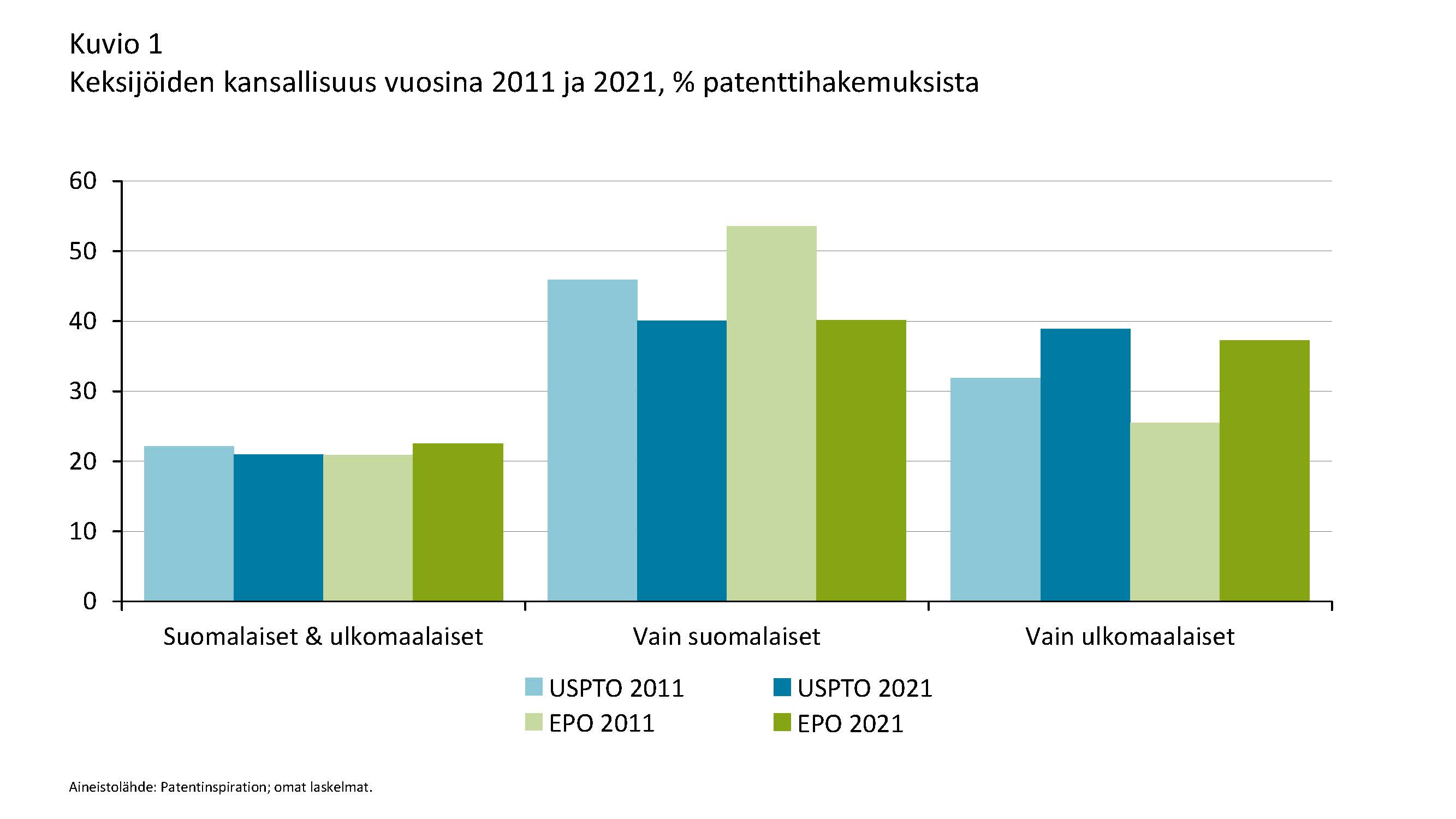 Suomalaisten hakemista patenteista Euroopan patenttivirastolta ja Yhdysvaltain patentti- ja tavaramerkkivirastolta vuosina 2011–2021 ilmenee, että ulkomaisilla keksijöillä ja kansainvälisellä yhteistyöllä on ollut merkittävä rooli koko suomalaisessa teknologiakehityksessä. Tuore Etla-tutkimus paljastaa, että vuonna 2021 haetuista patenteista jo 60 prosentissa oli mukana ulkomaalaisia keksijöitä. Ulkomaalaisten keksijöiden osuus näissä hakemuksissa on kasvanut koko 2010-luvun ajan.