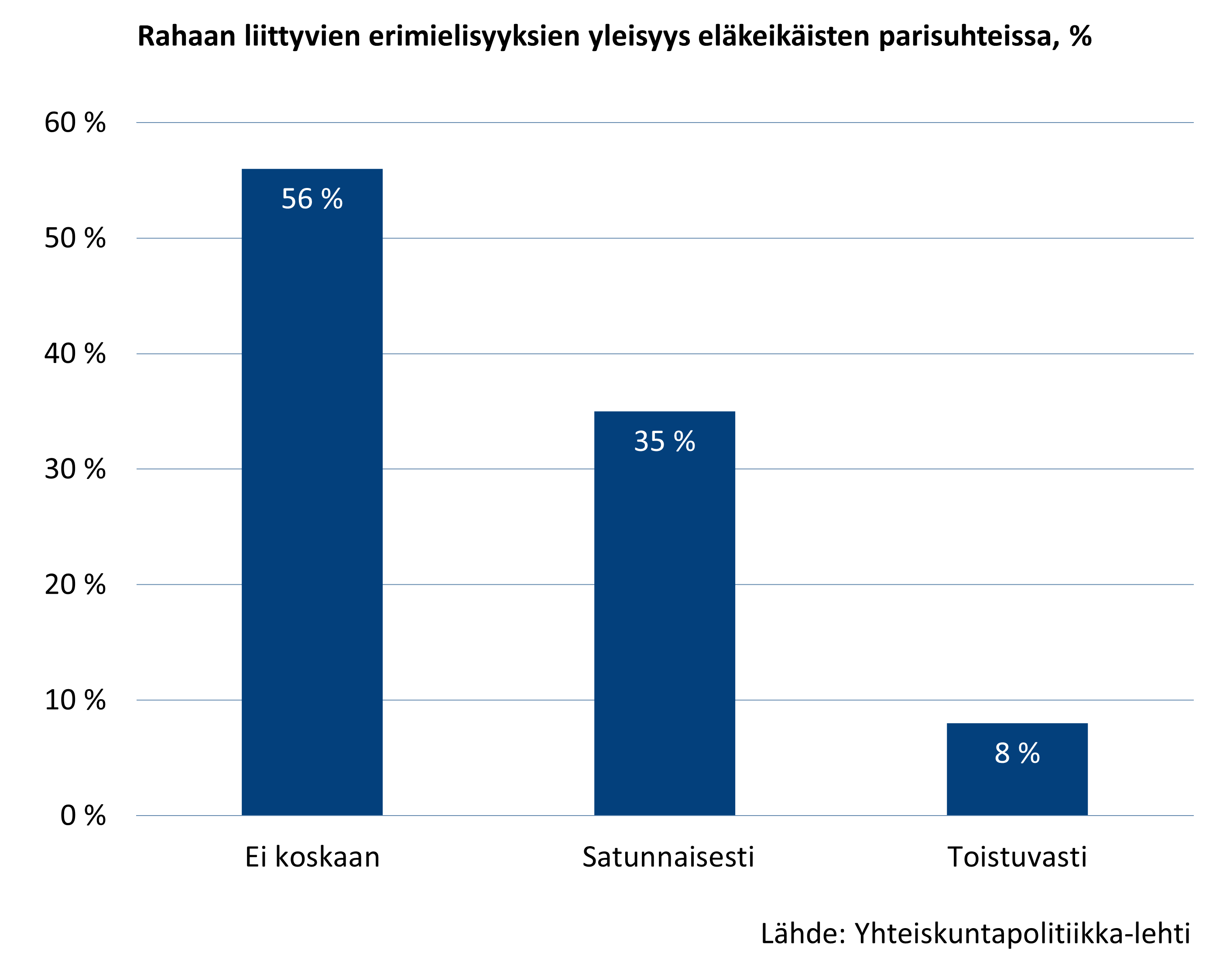 Eläkeläispariskunnista yli puolella ei ole tutkimuksen mukaan koskaan erimielisyyksiä raha-asioista. Satunnaisesti, kerran pari vuodessa, erimielisyyttä on runsaalla kolmasosalla. Toistuvasti, vähintään kerran kuukaudessa, eripuraa on alle kymmenesosalla eläkeläispariskunnista.