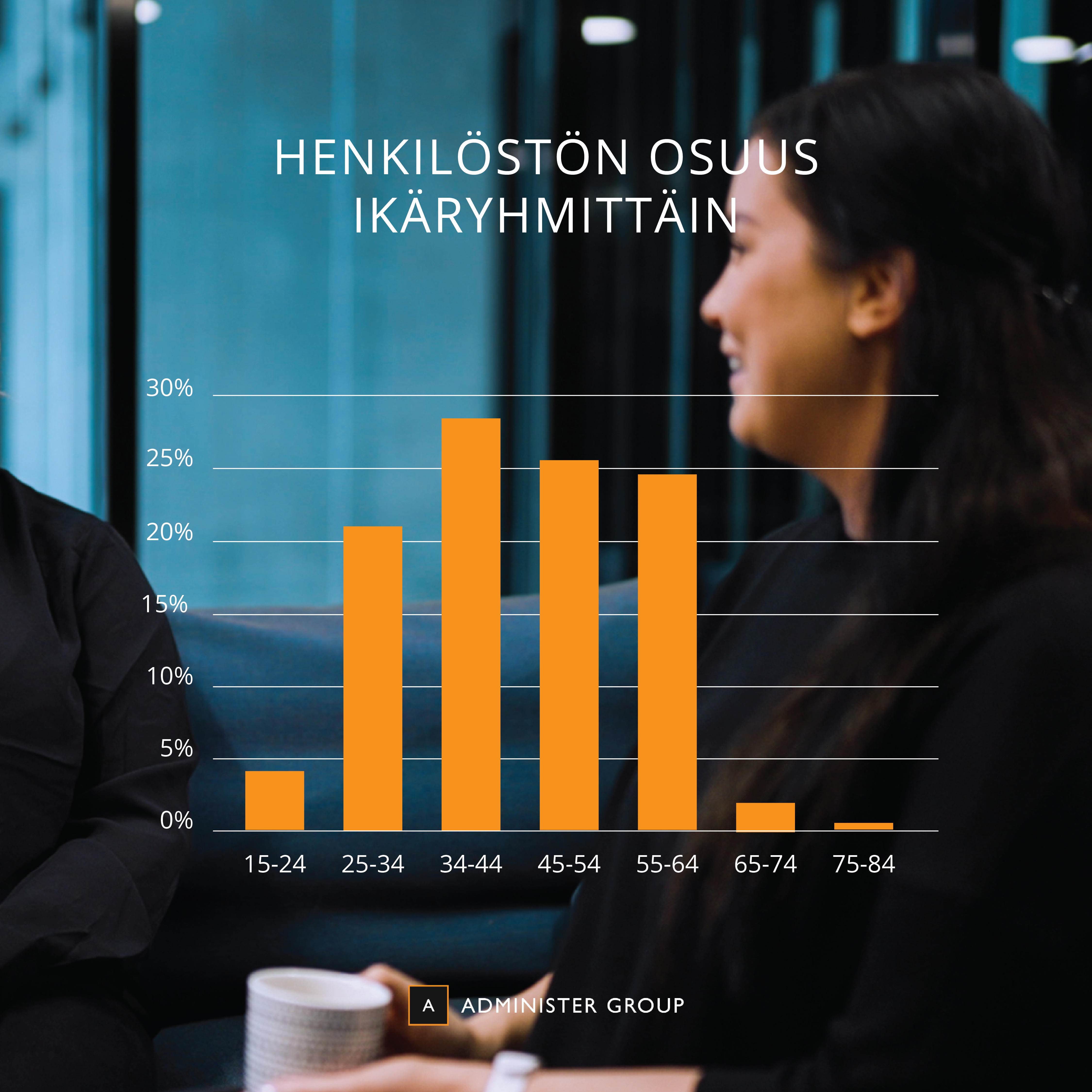 Taloushallintoala toimii hyvänä suunnannäyttäjänä eri ikäisten henkilöiden työllistämisessä, myös yli 55-vuotiaiden osalta. Administer Groupissa henkilöstön ikäjakauma on hyvin tasainen eri ikäluokissa, ja 25 % henkilöstöstä on yli 55-vuotiaita. Konsernin vanhimmat työntekijät ovat 70-vuotiaita.