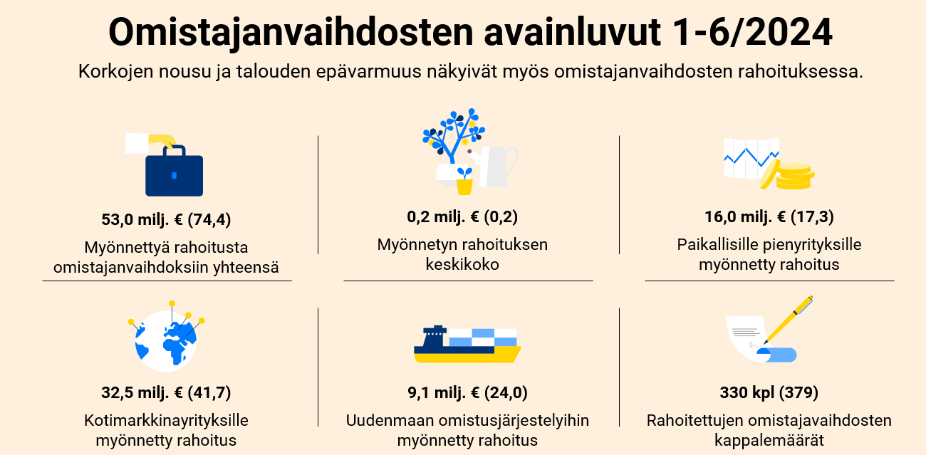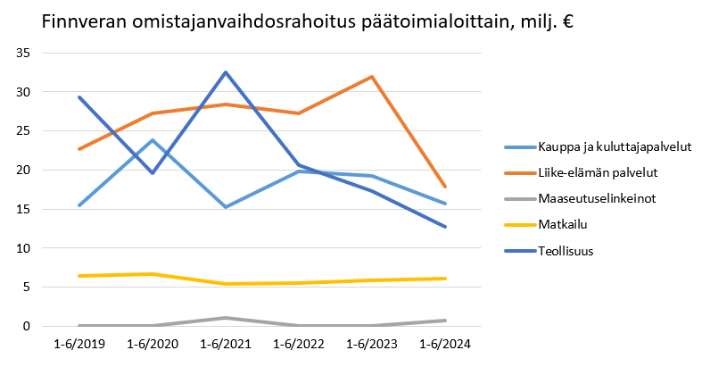 Aiempina vuosina omistajanvaihdoksia on rahoitettu toimialoista eniten liike-elämän palveluissa, joihin kuuluu muun muassa yritysten käyttämiä IT-palveluja, teknisiä palveluja, kirjanpitoa, konsultointia, työterveyspalveluja ja siivousta. Alkuvuonna 2024 yrityskauppojen rahoitus romahti liike-elämän palveluissa edellisvuoden vastaavan ajan 32 miljoonasta eurosta 18 miljoonaan euroon. Rahoitettujen yrityskauppojen lukumäärä aleni vain 10 prosenttia, mikä kertoo siitä, että rahoitus on kohdistunut alkuvuonna aiempaa enemmän pienten yrityksen omistusjärjestelyihin.