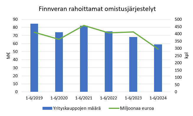 Korkojen nousu ja epävarmuus nakersivat edelleen erityisesti ostajien halukkuutta tehdä yrityskauppoja, ja yritysten omistusjärjestelyjen rahoitus laski alkuvuonna koko maassa. Finnvera rahoitti yrityskauppoja tammi–kesäkuussa 2024 yhteensä 53 miljoonalla eurolla (74), joka oli 29 prosenttia vähemmän kuin edellisvuoden vastaavana aikana. Myös rahoitettujen yrityskauppojen määrä laski 13 prosenttia 330 kappaleeseen (379). Korkotason kääntyminen selvään laskuun vaikuttaa todennäköisesti myönteisesti yrityskauppojen määrään loppuvuonna 2024.