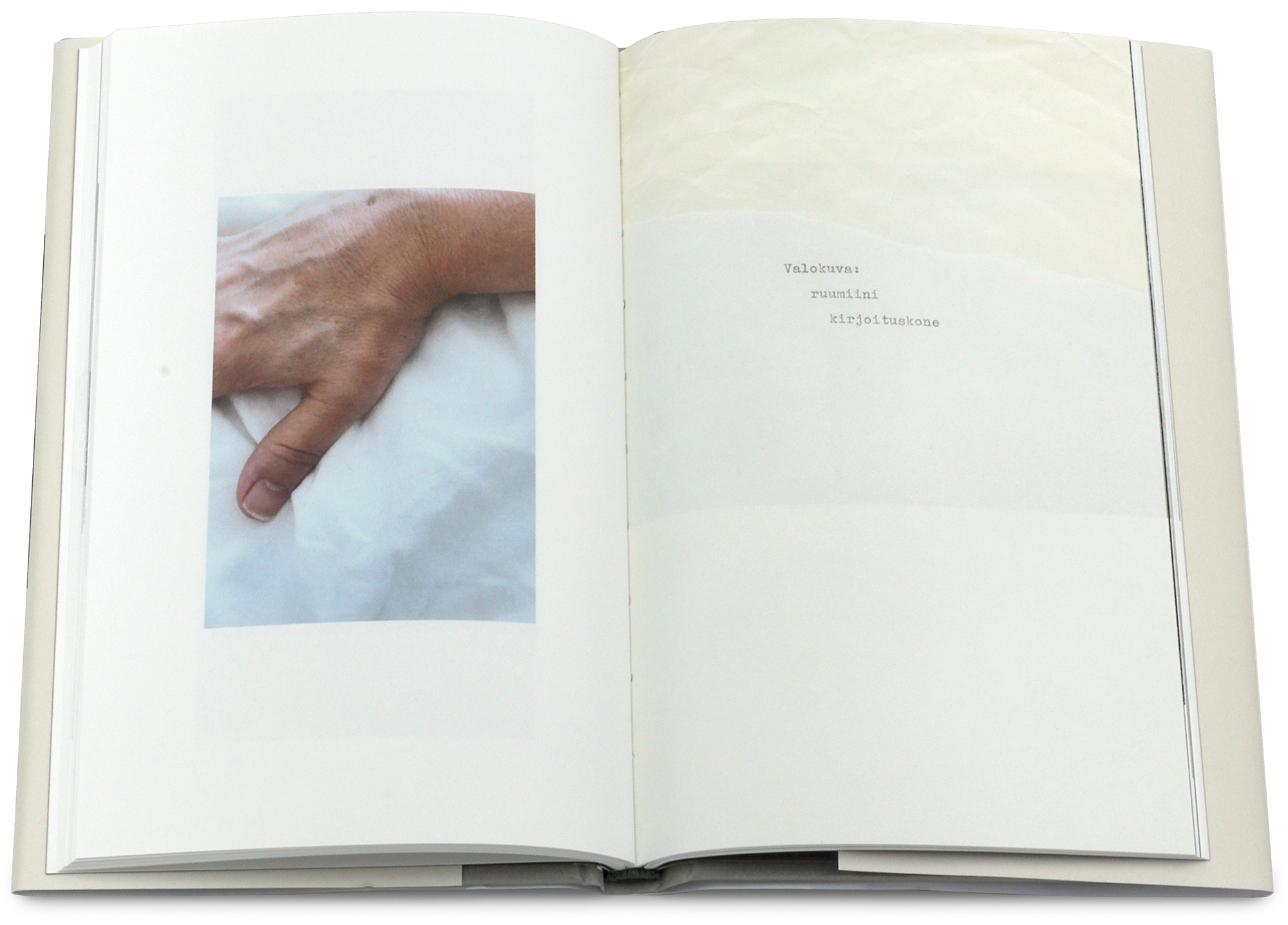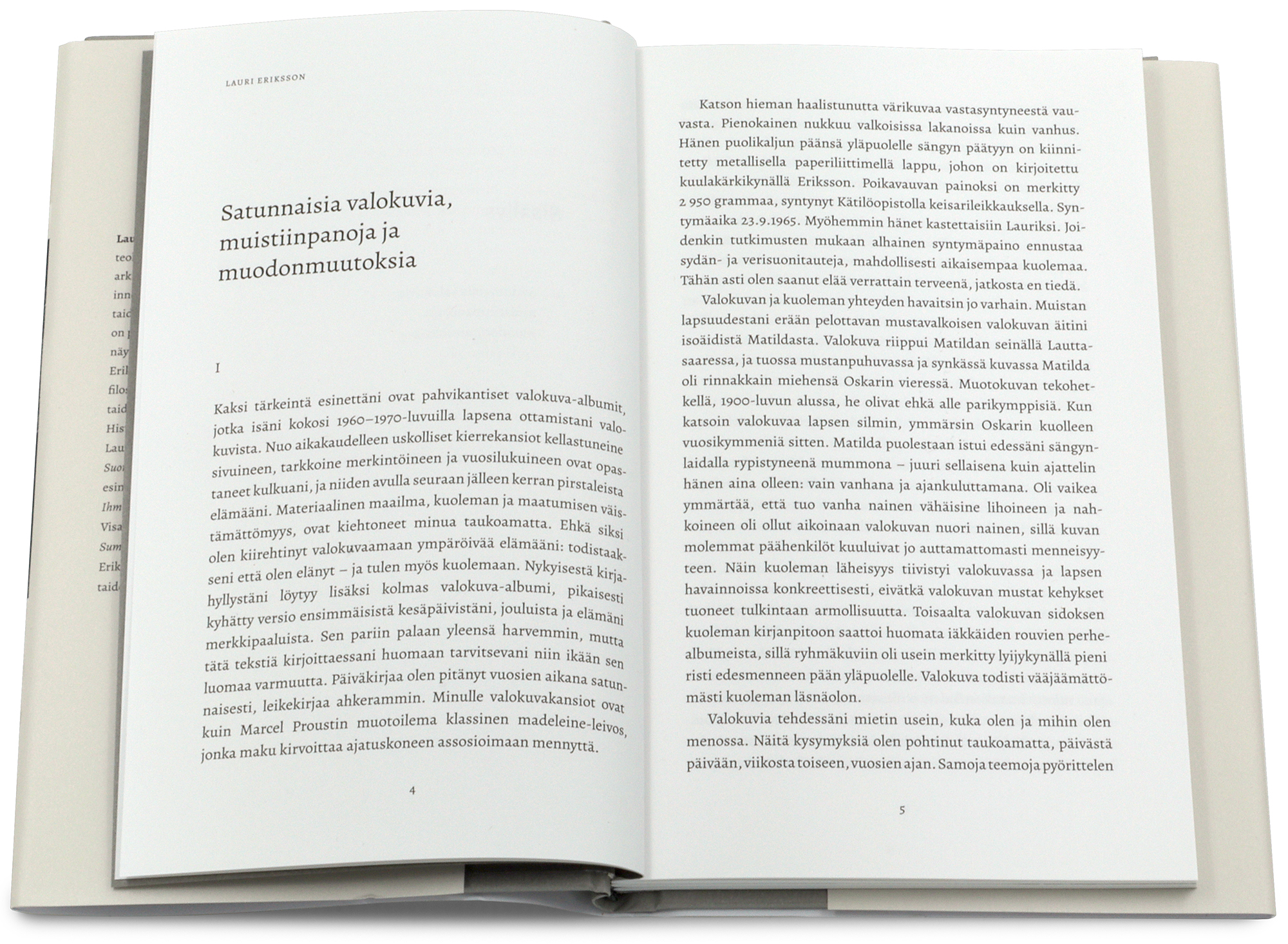 Nyt julkaistava kirja sisältää Lauri Erikssonin valokuvien lisäksi hänen kirjoittamansa esseen sekä muita fragmentaarisia tekstejä. Kirjan toisen esseen on kirjoittanut valokuvataiteilija Joel Karppanen (s. 1993). Kirjan teksteissä nämä kaksi eri sukupolveen kuuluvaa valokuvataiteilijaa käyvät dialogia valokuvan ja elämän kohtaamisissa.
