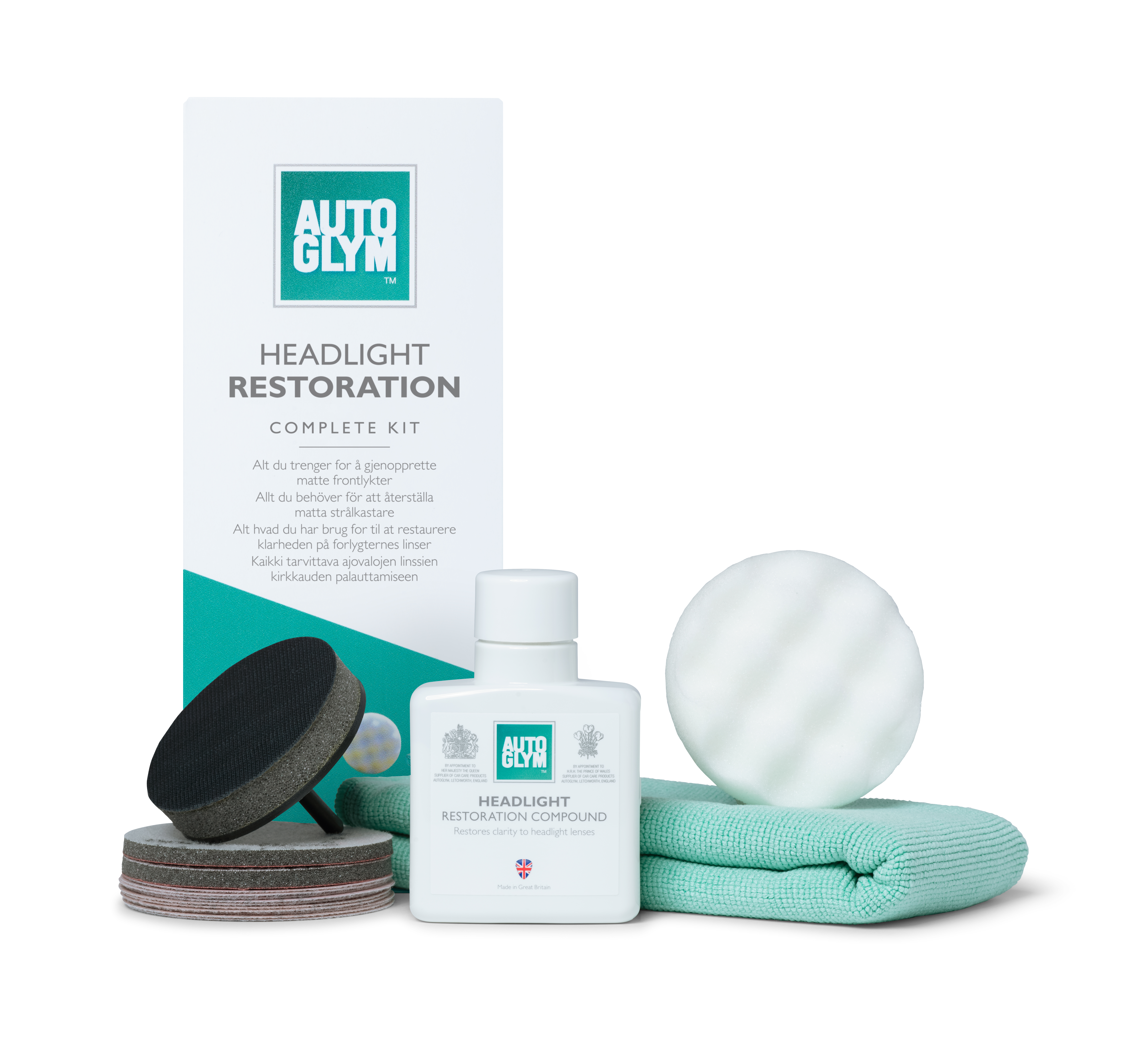 Etenkin vanhemmissa autoissa muovipintaiset ajovalot sumentuvat vuosien varrella. Kotikäyttöön suunniteltu kunnostussarja, Autoglym Headlight Restoration Complete Kit, palauttaa nopeasti ja tehokkaasti muovipintaisten ajovalojen kirkkauden. Kunnostussarja on helppokäyttöinen, ja sen käyttöön tarvitaan vain tavallinen porakone, suihkepullo ja puhdistusliinoja sekä suojalasit ja vaatteet, joiden likaantuminen ei haittaa. Käsittelyn jälkeen ajovalot ovat jälleen kuin uudet.