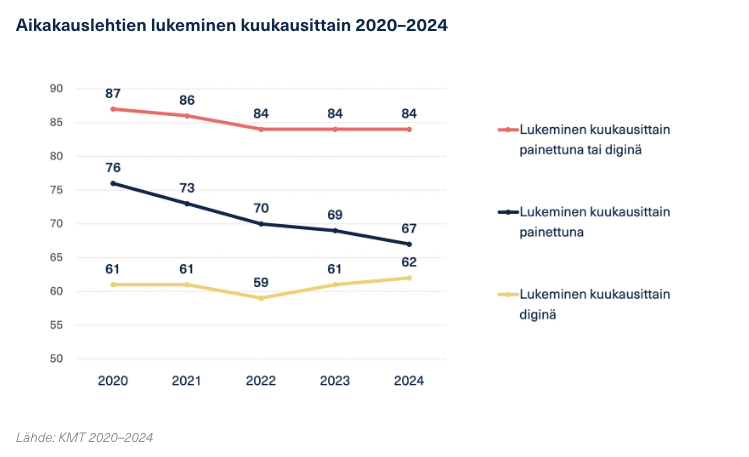 Painetun lehden lukeminen on vähentynyt trendinomaisesti, mutta digilukeminen on pysynyt vakaana ja jopa hieman noussut. Painettua lehteä lukee kuukausittain 67 prosenttia ja digikanavia 62 prosenttia.