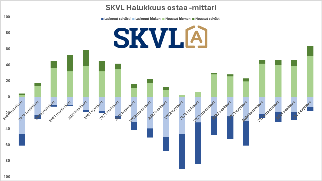 Asunnonmyyjät ovat nyt SKVL:n ostohalukkuus -mittarin mukaan motivoituneita. Ostajien halu tehdä ostopäätös on merkittävästi noussut. Myyjien kannalta alhaisempi hintataso on pääosin ymmärretty ja nyt markkinoilla alkaa tapahtumaan, kun ostajat saavat omia asuntojaan kaupaksi.