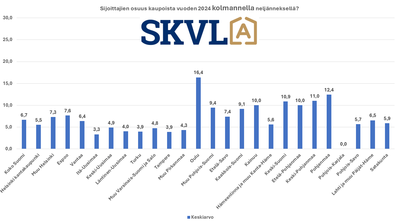 Sijoittajat ovat liikkeellä, mutta ei aivan yhtä paljon kuin edeltävällä vuosineljänneksellä. Noin 7 % kaupoista tekivät sijoittajat. Pohjoisemmassa Suomessa sijoittajien osuus on suurempi. Tyypillistä on markkinatilanteessa se, että ulkomaiset suuremmat sijoittajat ostavat Suomesta isompia nippuja asuntoja. Piensijoittajat ovat jonkin verran ostaneet lapsilleen asuntoja asumistuen muututtua tänä vuonna.