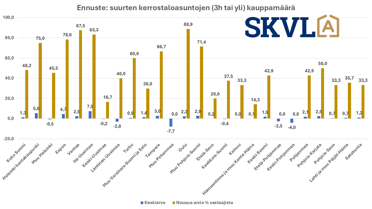 ”Asuntokauppa vilkastuu keskimäärin noin 1–3 % verrattuna edelliseen neljännekseen. Joillakin paikkakunnilla ja kysytyimmissä asuntotyypeissä vilkastuminen voi olla hiukan nopeampaa, mutta ihmisten henkilökohtaisen talouden epävarmuustekijät kuten todella monet YT-neuvottelut ovat edelleen jarruna nopealle vilkastumiselle”, toteaa SKVL:n toimitusjohtaja Jussi Mannerberg. ”Odotamme asuntojen hintojen säilyvän pääosin nykyisellä tasolla syksyn ajan lukuun ottamatta pienimpiä kerrostaloasuntoja, vanhempia omakotitaloja sekä uudiskohteita, joissa hinnat saattavat edelleen laskea jonkin verran”, hän jatkaa. ”Erityisesti kolmen suurimman pankin hitaus on tällä hetkellä suurin ongelma asuntokauppojen käytännön toteutumiselle halutuissa aikatauluissa”, kommentoi Mannerberg.