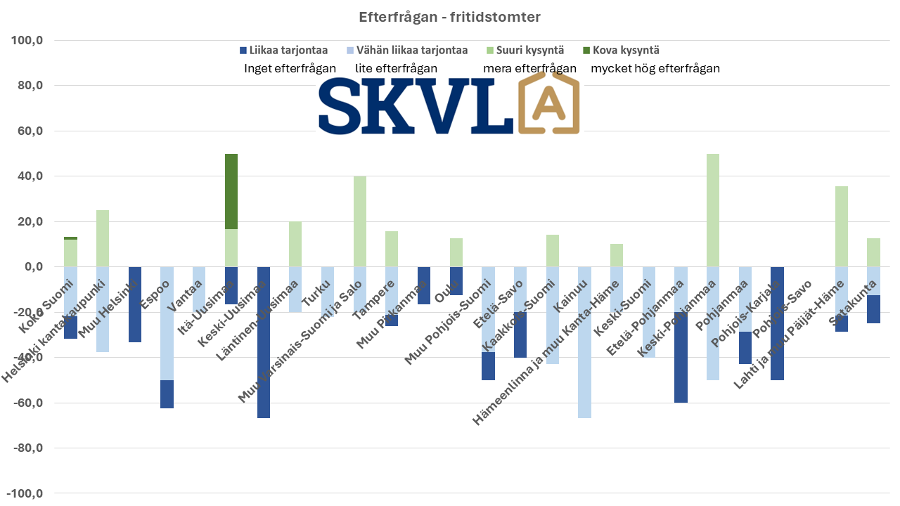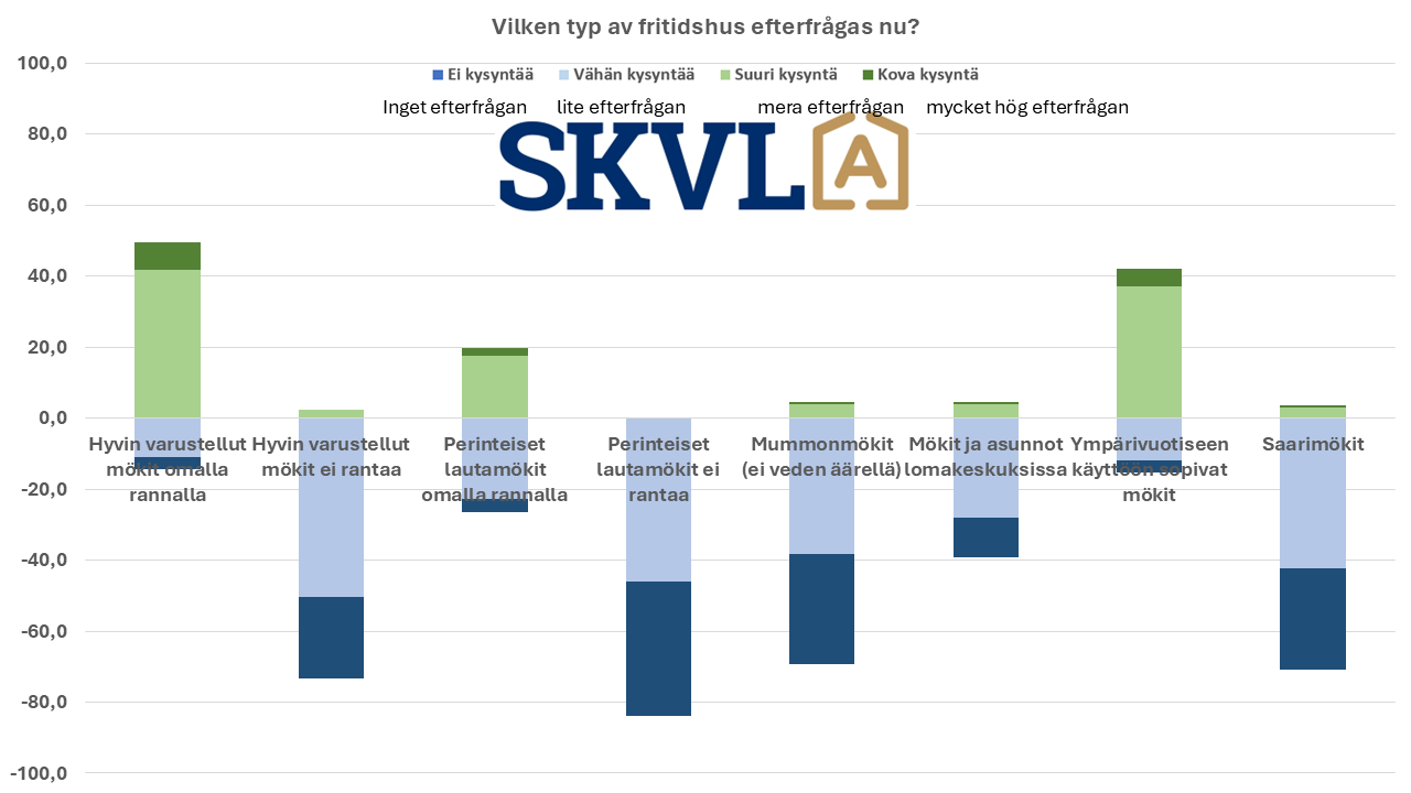 Försäljningen av fritidsbostäder har återgått till samma nivå som före coronaepidemin och har ökat något från i fjol. Prisnivån har sjunkit något. Något överraskande har lyxstugor varit efterfrågade och har även handlats med utländska centraleuropeiska köpare. Den globala uppvärmningen börjar också visa sig för många som ett motiv för att köpa en fritidsbostad längre norrut än i Centraleuropa, som är varmt på sommaren. Efterfrågan på skärgårdsstugor är klart sämstare utom i de populäraste avrinningsområdena i Egentliga Finland, Nyland och Södra Savolax.