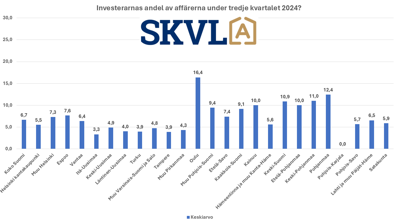 Investerarna är i rörelse, men inte riktigt lika mycket som under föregående kvartal. Cirka 7% av affärerna gjordes av investerare. Längre norrut i Finland är andelen placerare större. I marknadsförhållanden är det typiskt att större utländska investerare köper större grupper av bostäder i Finland. Privatinvesterare har köpt en del lägenheter till sina barn sedan bostadsbidraget ändrades i år.