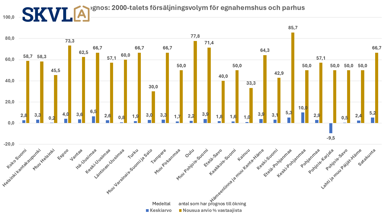 "Bostadsförsäljningen ökade med i genomsnitt cirka 1–3 procent jämfört med föregående kvartal. På en del orter och i de mest efterfrågade boendeformerna kan återhämtningen vara något snabbare, men osäkerheten i den personliga ekonomin, såsom så många samarbetsförhandlingar, bromsar fortfarande den snabba tillväxten, säger Jussi Mannerberg, verkställande direktör för SKVL. – Vi räknar med att bostadspriserna i huvudsak kommer att ligga kvar på nuvarande nivå under hösten, med undantag för de minsta lägenheterna i flerfamiljshus, äldre småhus och nybyggnationer där priserna kan fortsätta att sjunka något, fortsätter han. – I synnerhet de tre största bankernas långsamhet är för närvarande det största problemet för att bostadsaffärerna ska kunna genomföras i praktiken inom önskad tidtabell, säger Mannerberg.