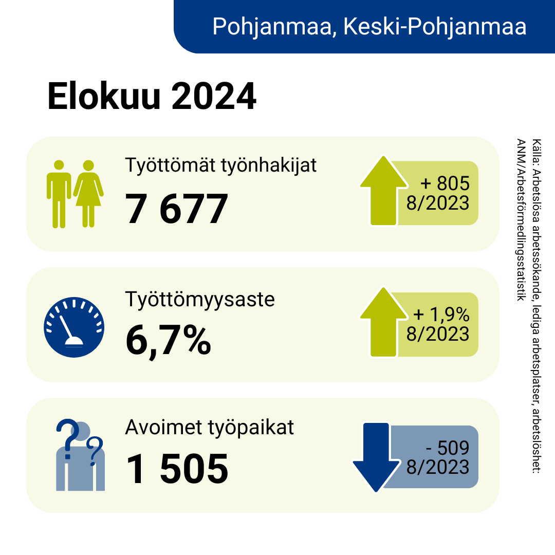 Pohjanmaan ELY-keskusalueella (Pohjanmaa, Keski-Pohjanmaa) oli elokuun lopussa yhteensä 7 677 työtöntä työnhakijaa. Se on 805 enemmän kuin vuotta aikaisemmin. Työttömiä oli elokuussa 1 471 vähemmän kuin heinäkuussa. Pohjanmaan ELY-keskusalueen työttömien työnhakijoiden osuus työvoimasta on Manner-Suomen alhaisin (6,7 %). Koko maassa vastaava osuus on 10,4 %. Heinäkuuhun verrattuna työttömyysaste pienentyi 1,3 prosenttiyksikköä Pohjanmaan ELY-keskuksen alueella ja 1,0 prosenttiyksikköä koko maassa. Elokuussa oli avoinna 1 505 uutta työpaikkaa, mikä on 509 työpaikkaa (- 25,3 %) vähemmän kuin vuotta aikaisemmin. Kokoaikaisesti lomautettuja oli 449 eli 18 vähemmän kuin vuotta aikaisemmin (- 3,9 %). Tiedot ilmenevät työ- ja elinkeinoministeriön Työnvälitystilastosta.