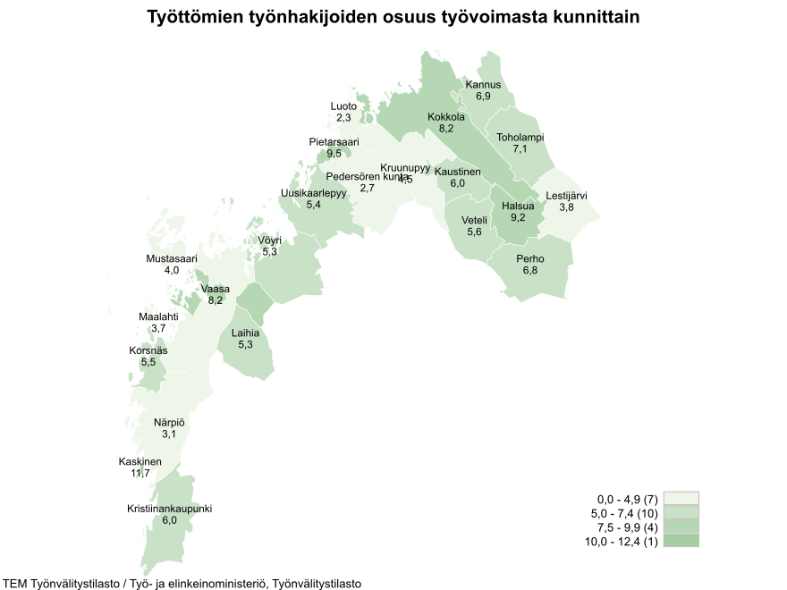 Työttömien työnhakijoiden määrä kasvoi useimmissa Pohjanmaan ELY-keskusalueen seutukunnissa vuoden takaiseen verrattuna. Työttömyys pienentyi ainoastaan Kaustisen seutukunnassa, jossa työttömänä oli 19 henkilöä vähemmän kuin vuotta aikaisemmin (- 5 %). Työttömien määrä kasvoi Vaasan seudulla 547 henkilöllä (+ 18 %), Pietarsaaren seudulla 246 henkilöllä (+ 22 %), Kokkolan seutukunnassa 19 henkilöllä (+ 1 %) ja Suupohjan rannikkoseudulla 12 henkilöllä (+ 4 %). Pohjanmaan ELY-keskusalueen seutukunnista alhaisin työttömyysaste oli Suupohjan rannikkoseudulla (4,7 %).