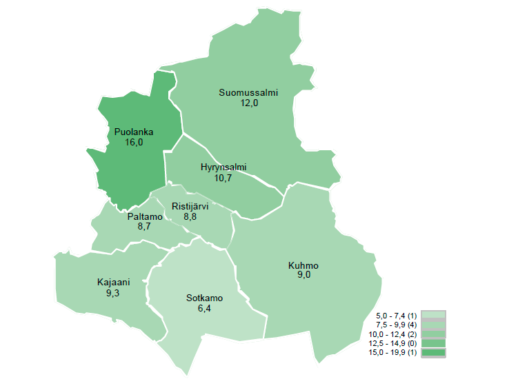 Työttömyysaste oli Kainuussa kuun lopussa 9,3 %, alueista viidenneksi vähiten ja 1,4 prosenttiyksikköä enemmän kuin vuotta aiemmin. Koko maassa työttömyysaste oli 10,4 %, mikä on prosenttiyksikön vuoden takaista enemmän.