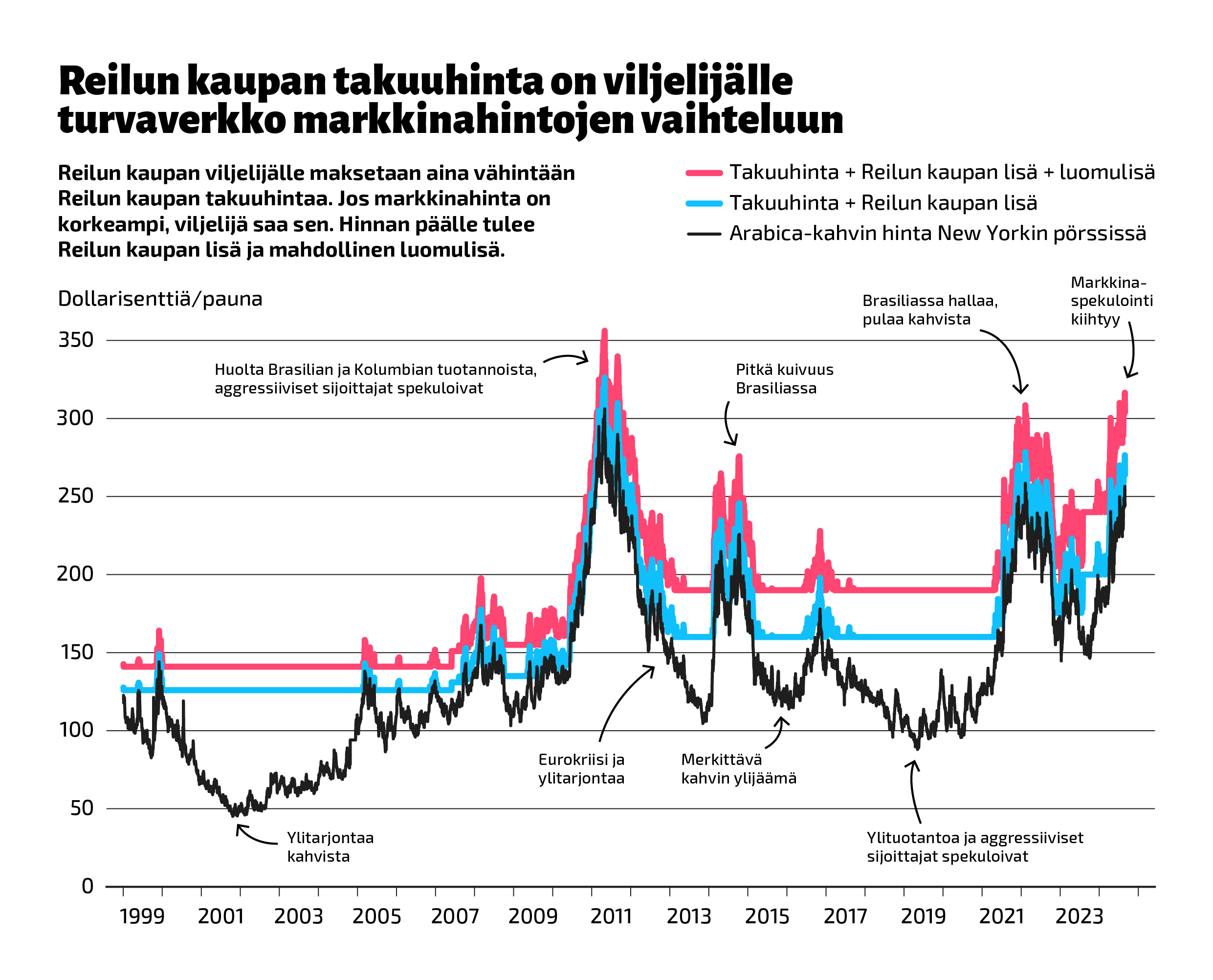 Alla oleva kuva havainnollistaa kahvimarkkinan hintakehitystä pörssihinnan ja Reilun kaupan tuottajille maksettavan hinnan näkökulmasta.