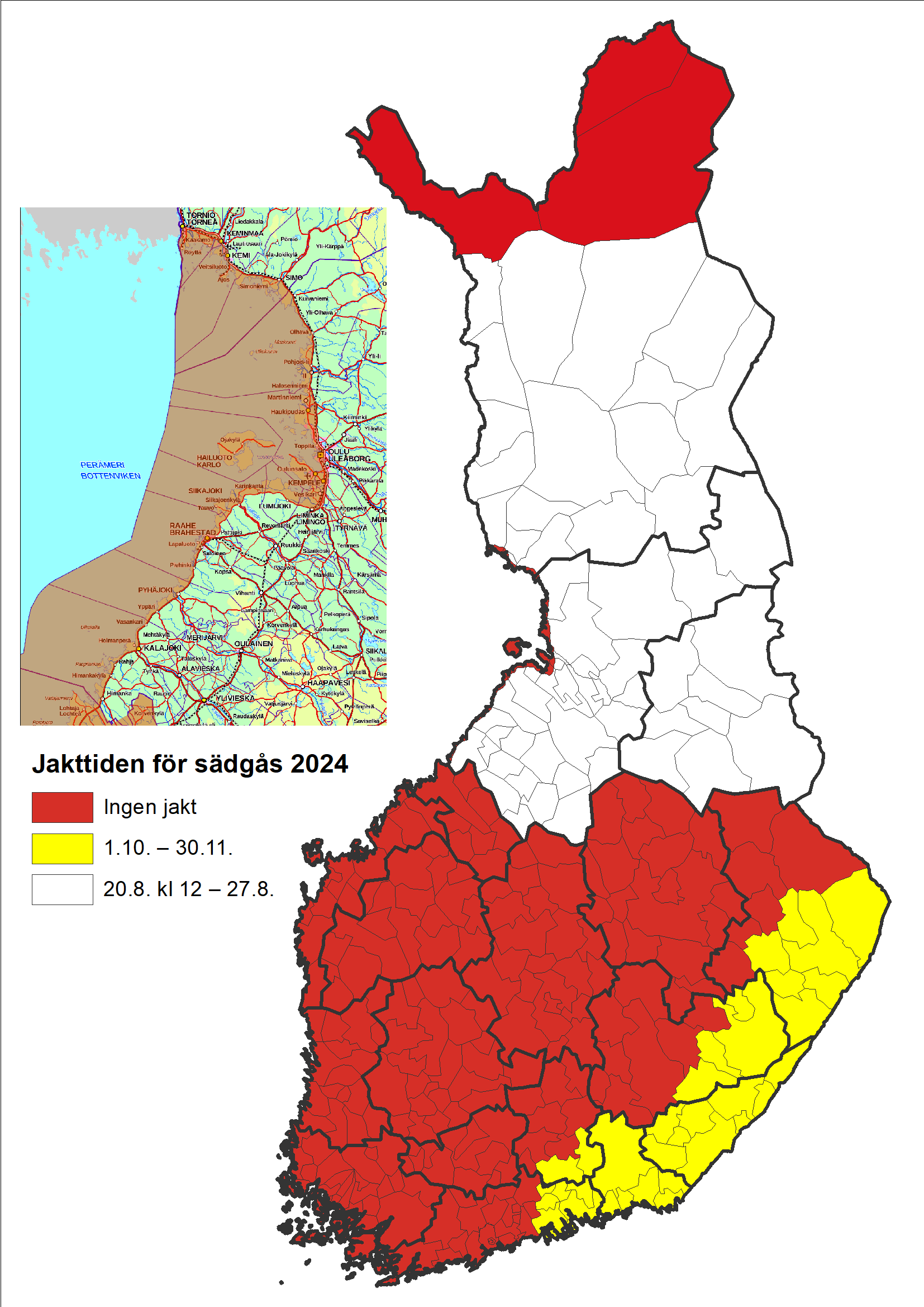 Jakt på sädgås är tillåten i följande områden: landskapen Södra Karelen och Kymmenedalen, kommunerna Enonkoski, Puumala, Nyslott och Sulkava i landskapet Södra Savolax, kommunerna Ilomants, Joensuu, Kides, Kontiolax, Liperi, Rääkkylä och Tohmajärvi i landskapet Norra Karelen, kommunerna Itis och Orimattila som hör till landskapet Päijänne-Tavastland samt kommunerna Askola, Lappträsk, Lovisa, Mörskom, Borgå och Pukkila i landskapet Nyland.