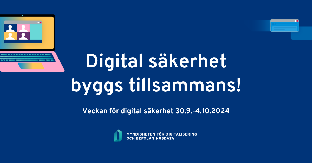 Myndigheten för digitalisering och befolkningsdata genomför den femte veckan för digital säkerhet den 30 september till den 4 oktober i samarbete med centrala myndigheter och andra aktörer. Över 170 organisationer inom den offentliga förvaltningen har anmält sig till veckan och kampanjen omfattar över 240 000 personer. Under veckan genomförs webbinarier i samarbete med bland annat Jyväskylä yrkeshögskola, Jyväskylä universitet, Tammerfors stad och Sitra. Mer information: https://dvv.fi/sv/veckan-for-digital-sakerhet