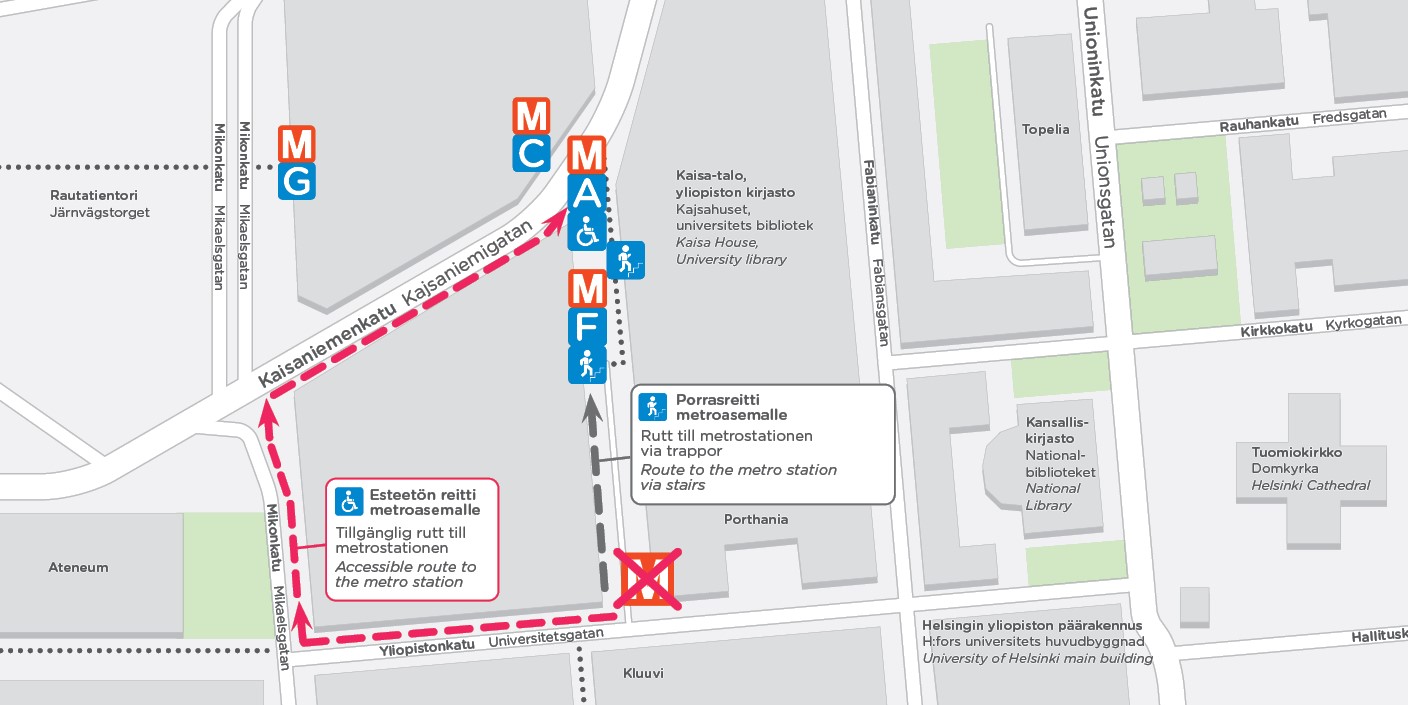 Hissit ovat käytössä Kaisaniemenkadun sisäänkäynneillä A ja B.