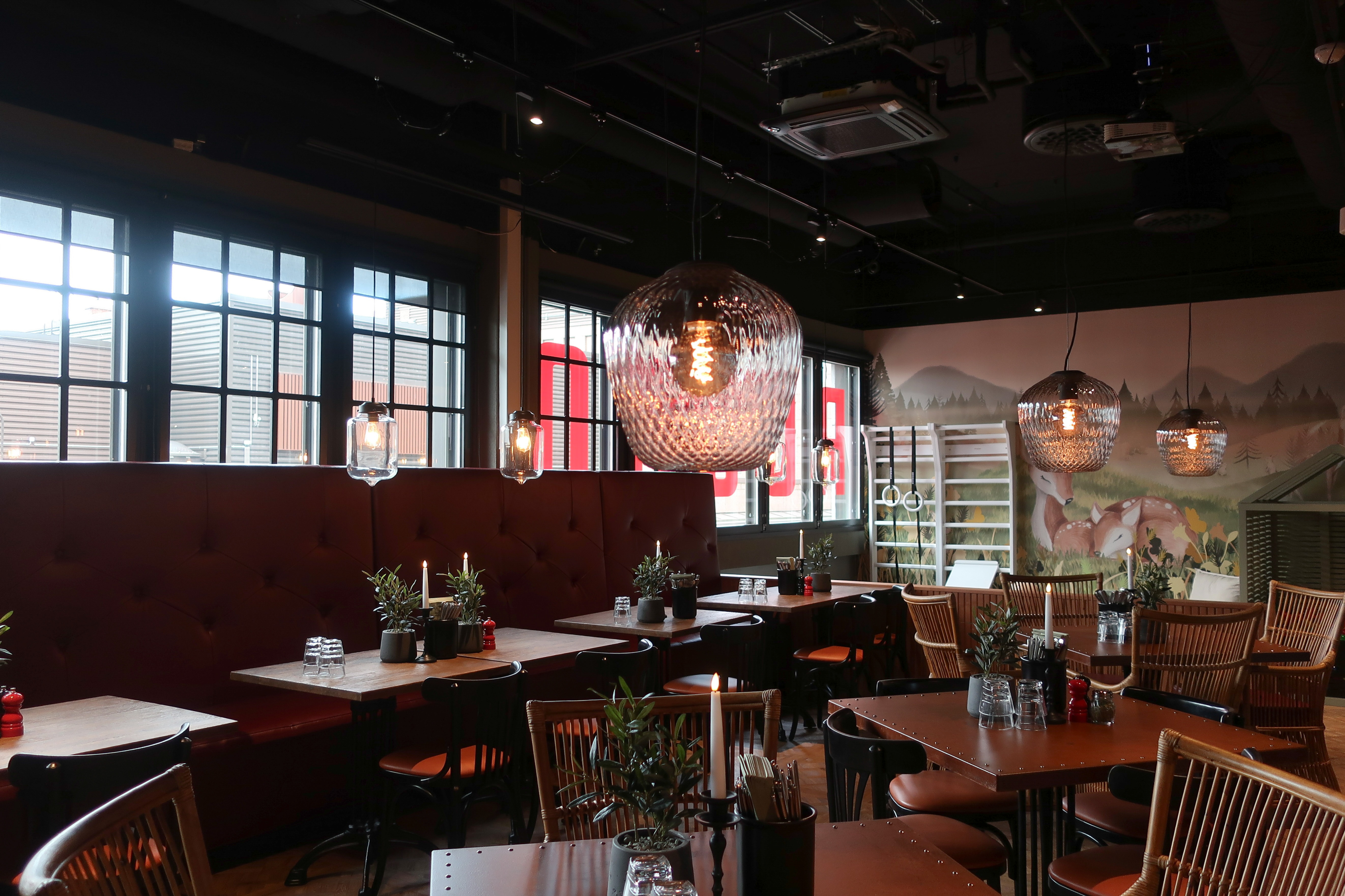 Moderni ravintola, jossa on puiset pöydät, tuolit ja suuret riippuvalaisimet. Taustalla on maalattu seinä taideteoksella.