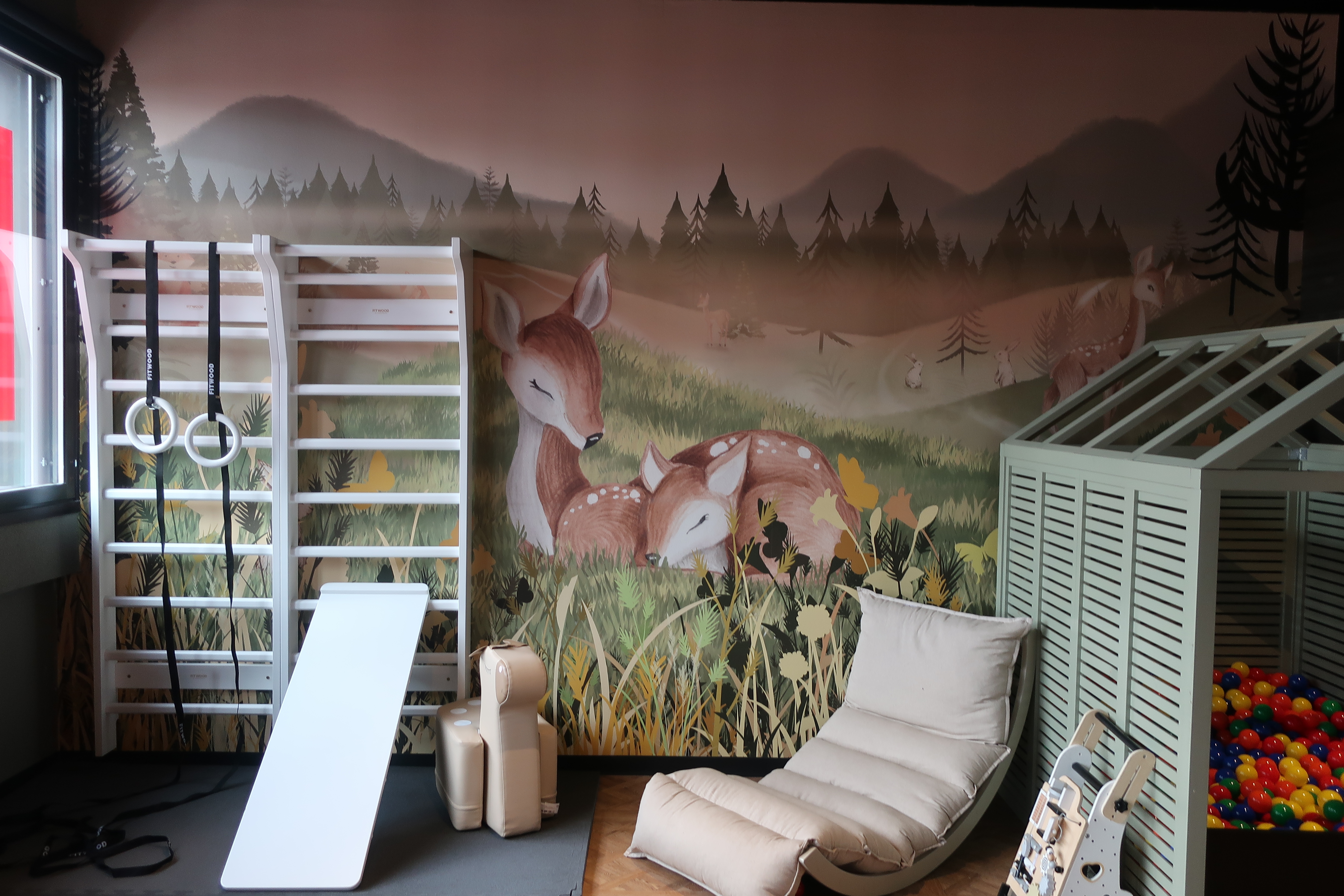 Kuva lasten leikkihuoneesta, jossa on metsäaiheinen seinämaalaus. Huoneessa on puolapuut, liikuntavälineitä, nojatuoli ja pallomeri.