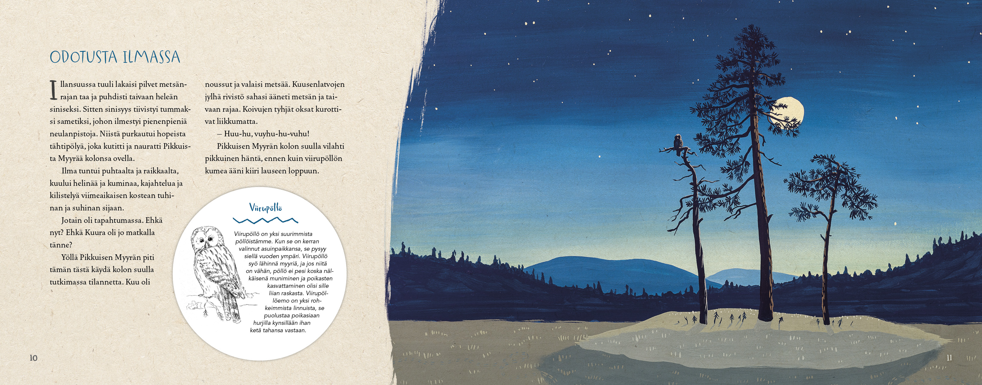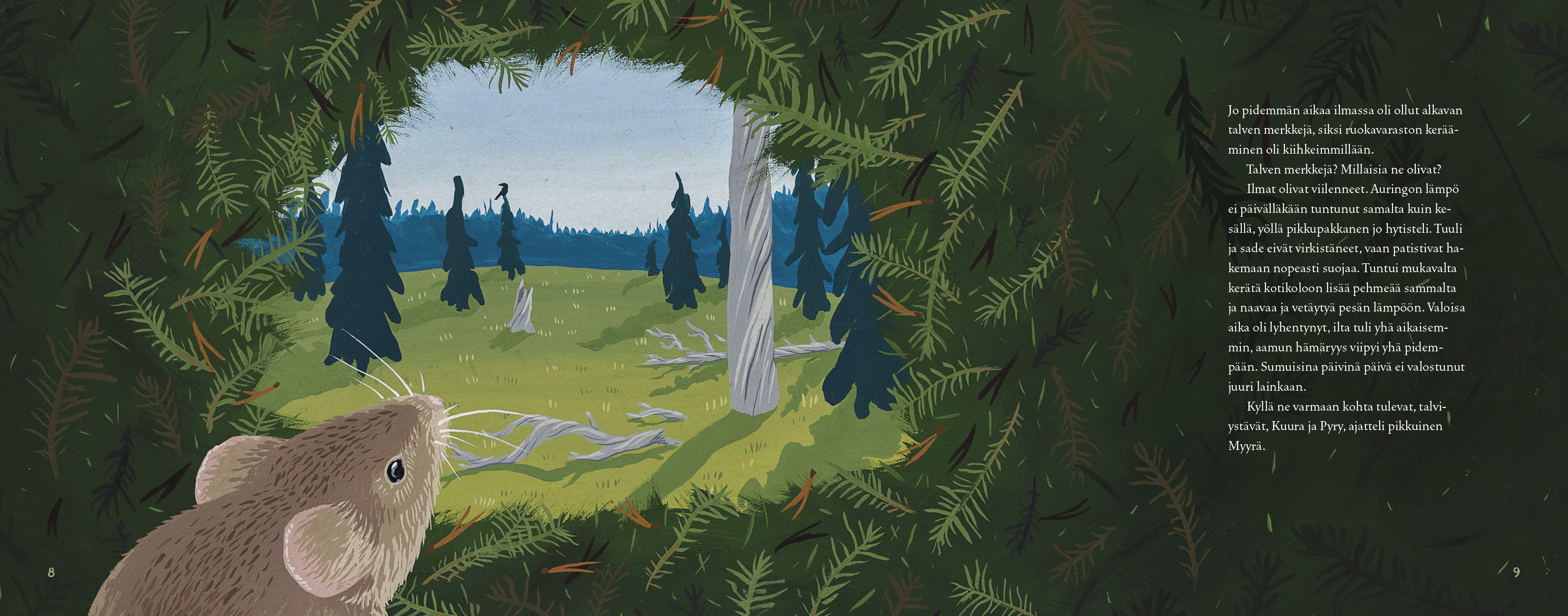Pikkuinen Myyrä oli saanut talvivarastonsa täyteen. Se odotti Kuuraa ja Pyryä, jotta kaikki herkut säilyisivät pitkän talven yli. Ja tulihan se talvi! Lumi peitti maiseman ja antoi suojaa ja silmiä hivelevää kauneutta. Oli paukkupakkasia ja tähtisumua, uppolunta, kieppejä ja tykkylunta.