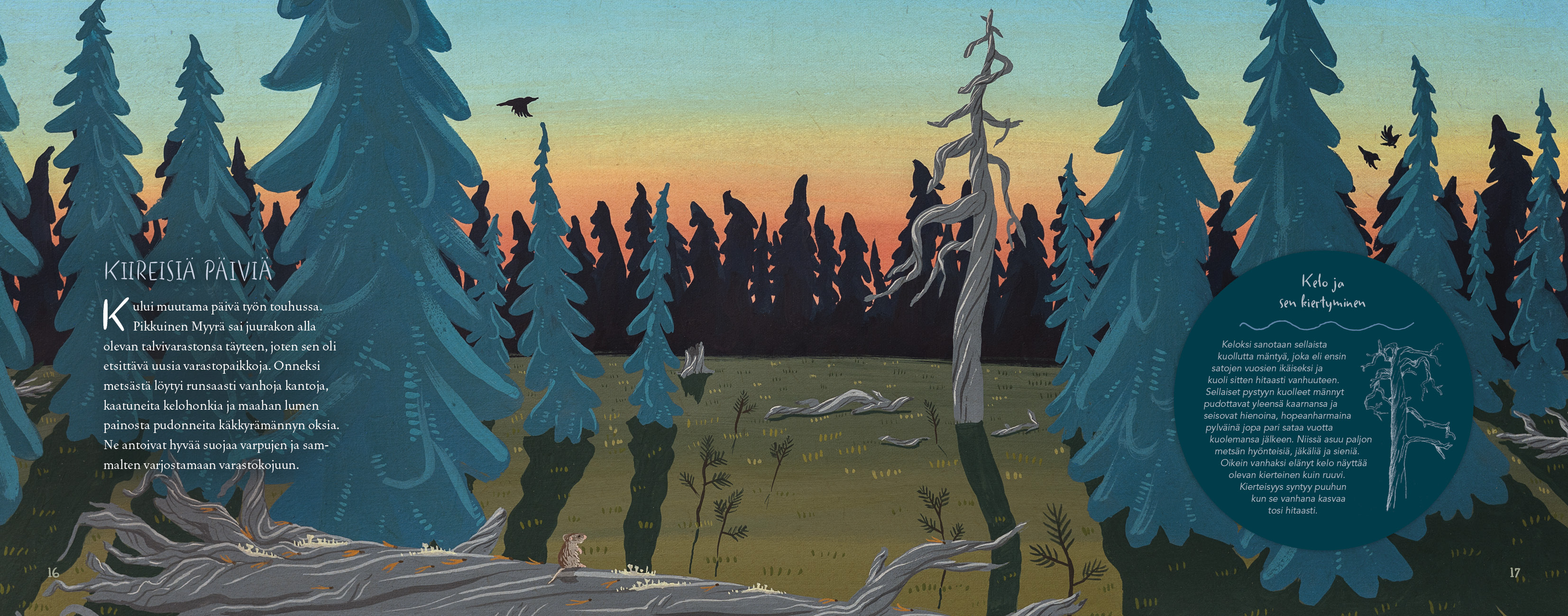 Teoksen tekijäjoukossa yhdistyy monipuolinen kokemus luonnosta ja julkaisutoiminnasta ja yhteinen rakkaus vanhoihin metsiin. Satutekstin kirjoittanut Raija Järvinen on julkaissut aiemmin Metson soitimesta kertovan teoksen ja kuvituksen tehnyt Anna Pakkanen on pohjoisen luontoon erikoistunut ammattikuvittaja ja -taiteilija. Tietolaatikot kirjoittaneet Kerttu Kotakorpi ja Panu Halme ovat tieteellisen tiedon yleistajuistamiseen vihkiytyneitä luonnontieteilijöitä.