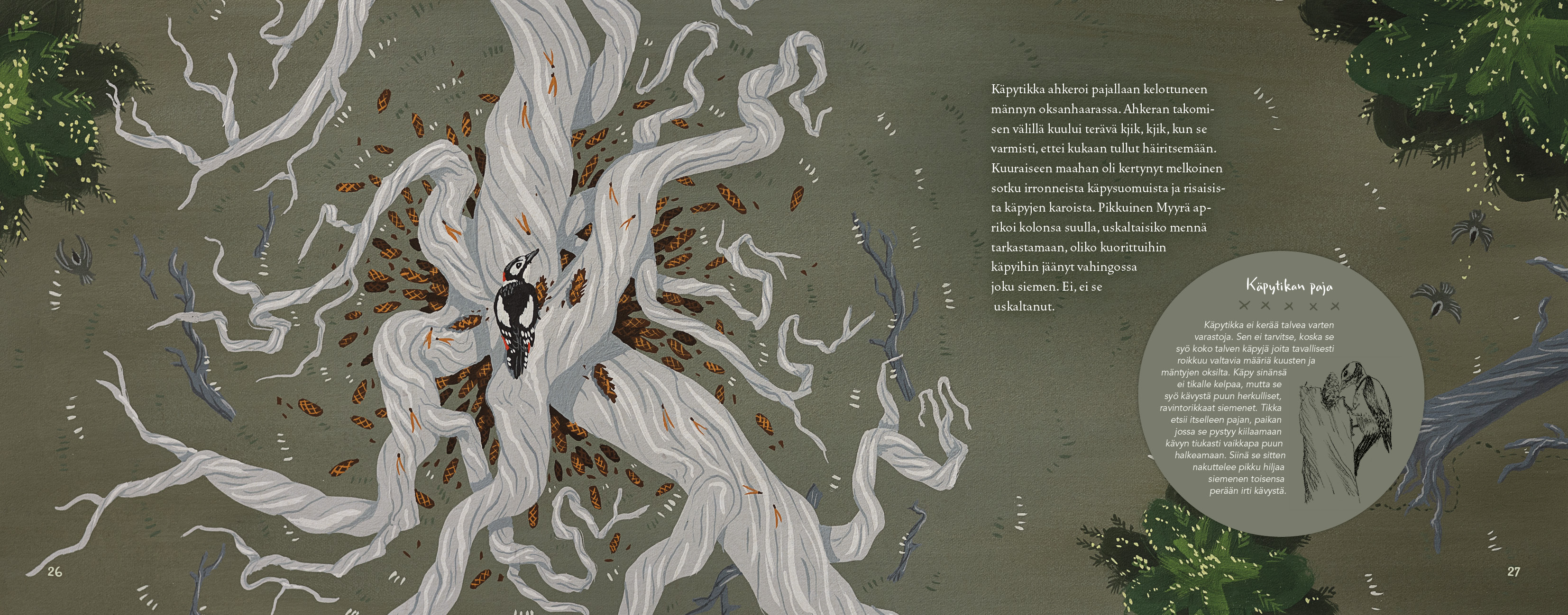 Panu Halme on luonnonsuojelubiologian tutkija ja opettaja. Panu on ollut kirjoittamassa useita tietokirjoja ja hän on aktiivinen tieteen yleistajuistaja ja sosiaalisen median viestijä. Panu on rikkonut tieteen ja taiteen rajoja teatterin ja tanssin maailmassa ja johtanut hankkeita, joissa on viestitty luontokadosta myös lapsille. Tähän teokseen Panu on kirjoittanut tietolaatikoita kirjassa esiintyvistä hahmoista ja luontoilmiöistä.