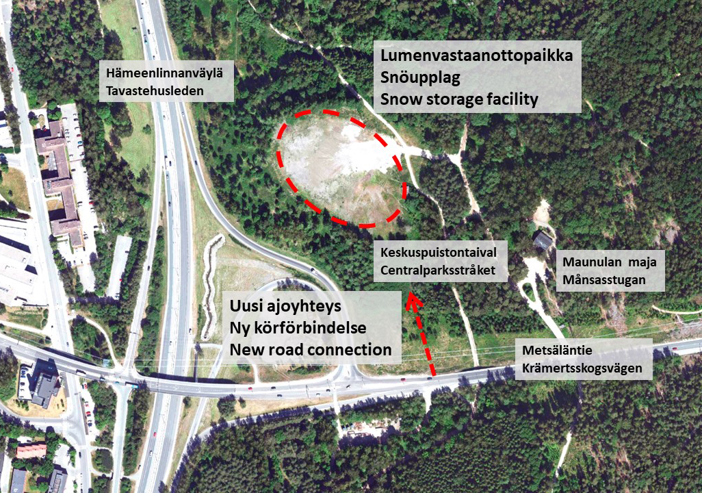 Metsäläntien ja Hämeenlinnanväylän läheisyyteen suunnitellaan pysyvää lumenvastaanottopaikkaa ja lumenkuljetuksille tarkoitettua uutta ajoliittymää.