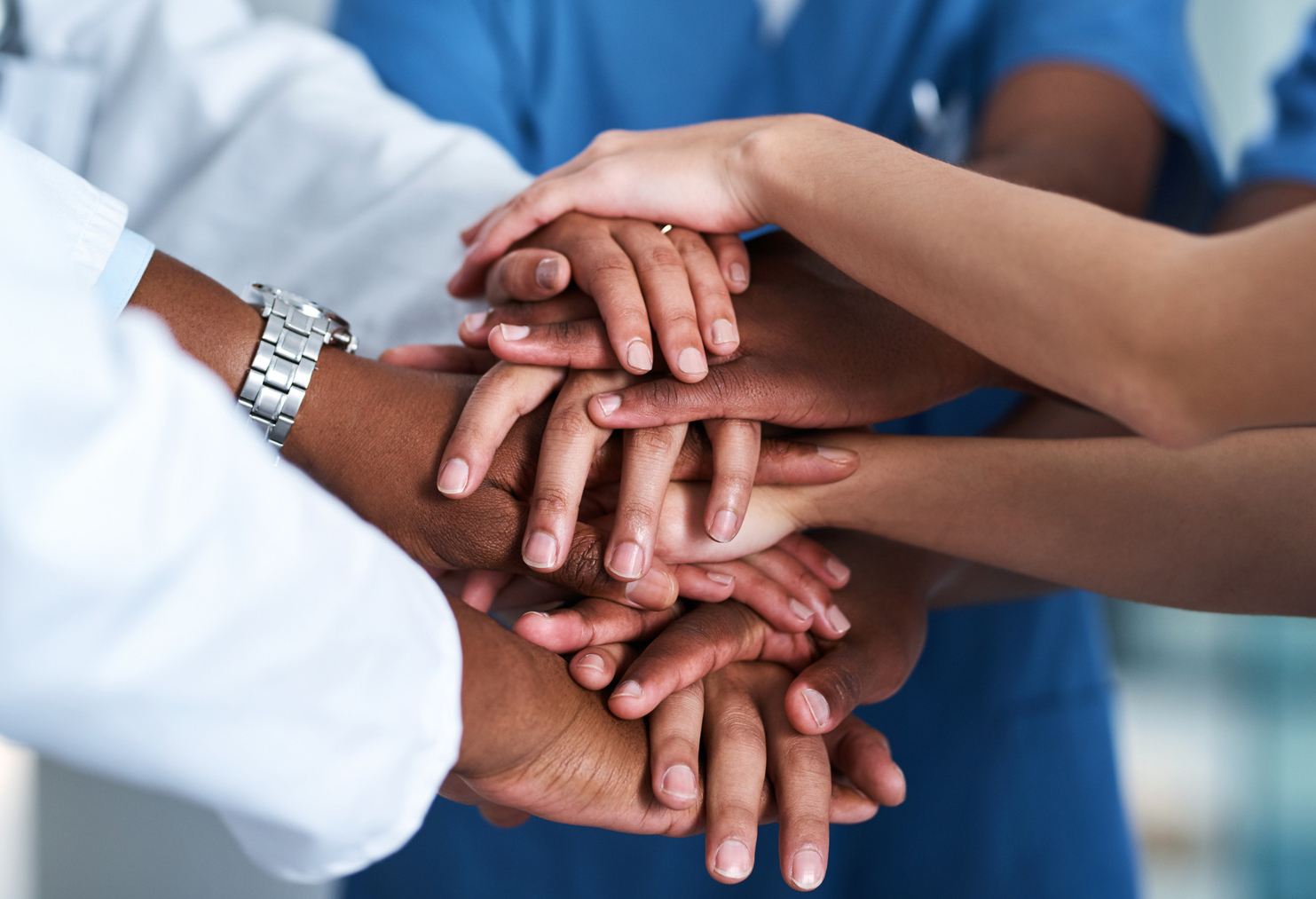 Useita eri ihmisten käsiä päällekkäin, symboloiden tiimityötä ja yhteistyötä.
