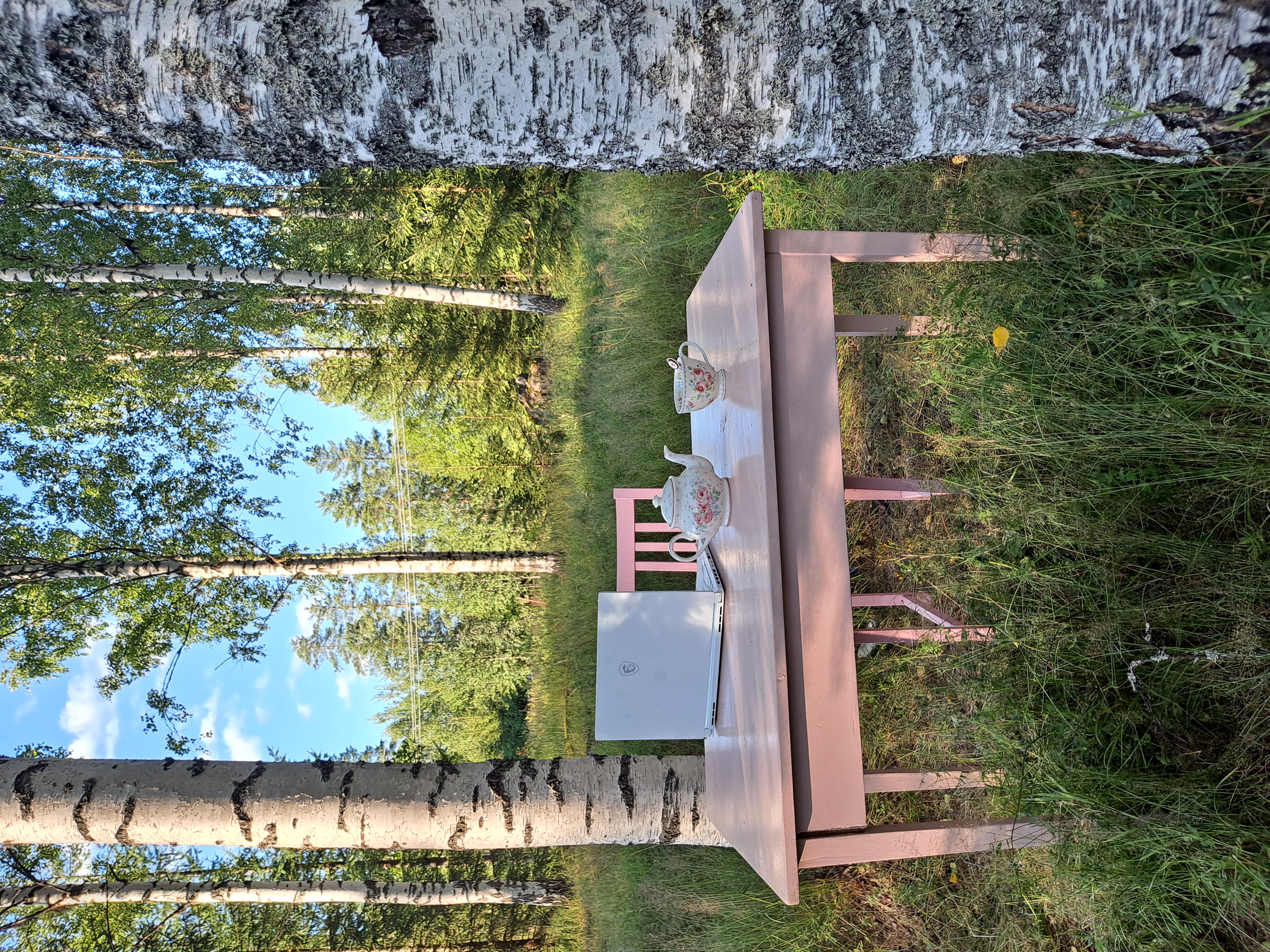 Sekä vaaleanpunaisesta kirjoituspöydästäni, joka seisoo puutarhamme laidalla olevassa koivikossa ja odottaa unelmiani.