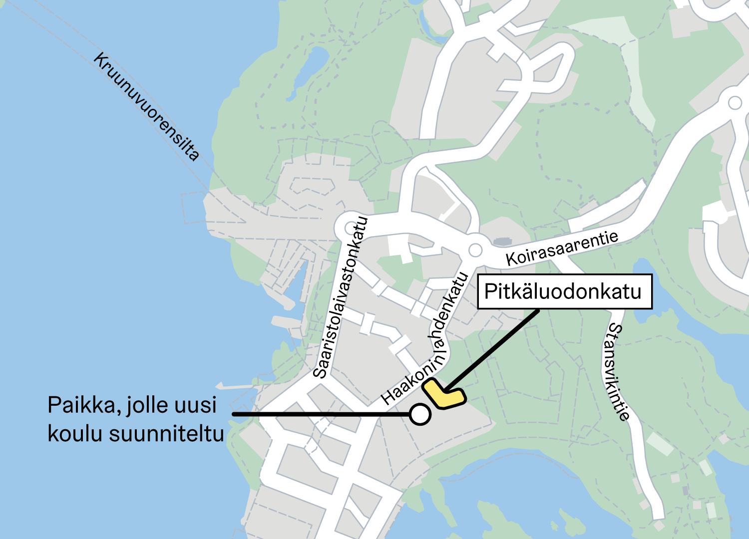 Kaupunki edistää uuden Kruunuvuorenrannan koulun rakentamista. Pitkäluodonkadun rakentaminen mahdollistaa Kruunuvuorenrannan uuden koulun rakentamisen viereiselle tontille.