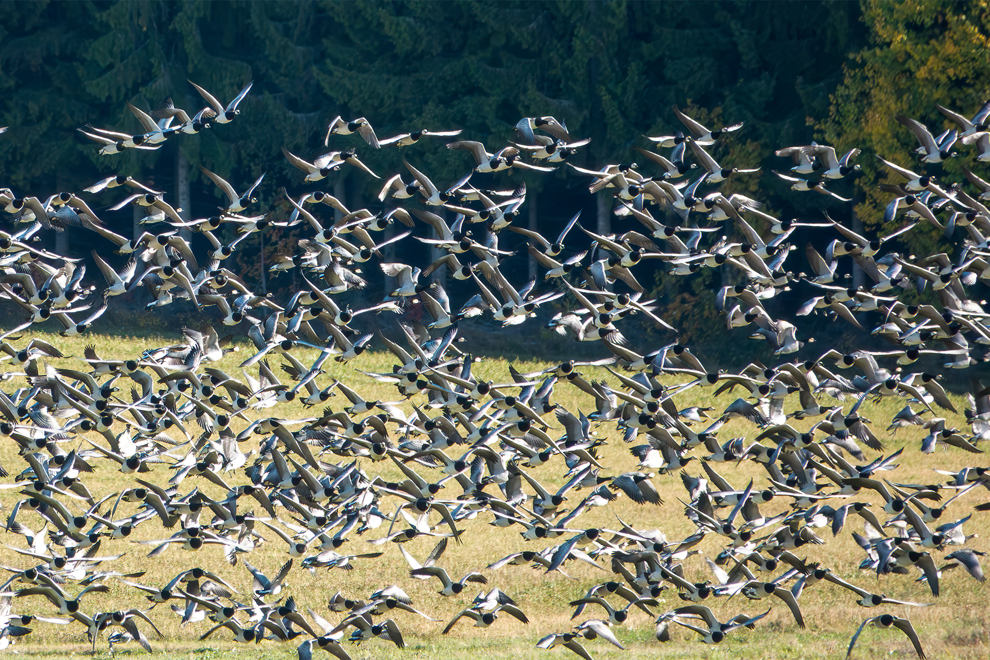 Valkoposkihanhia Kontiolahden Pöllönvaarassa 1.10.2024. Kuva: Jari Kontiokorpi / Pohjois-Karjalan ELY-keskus.