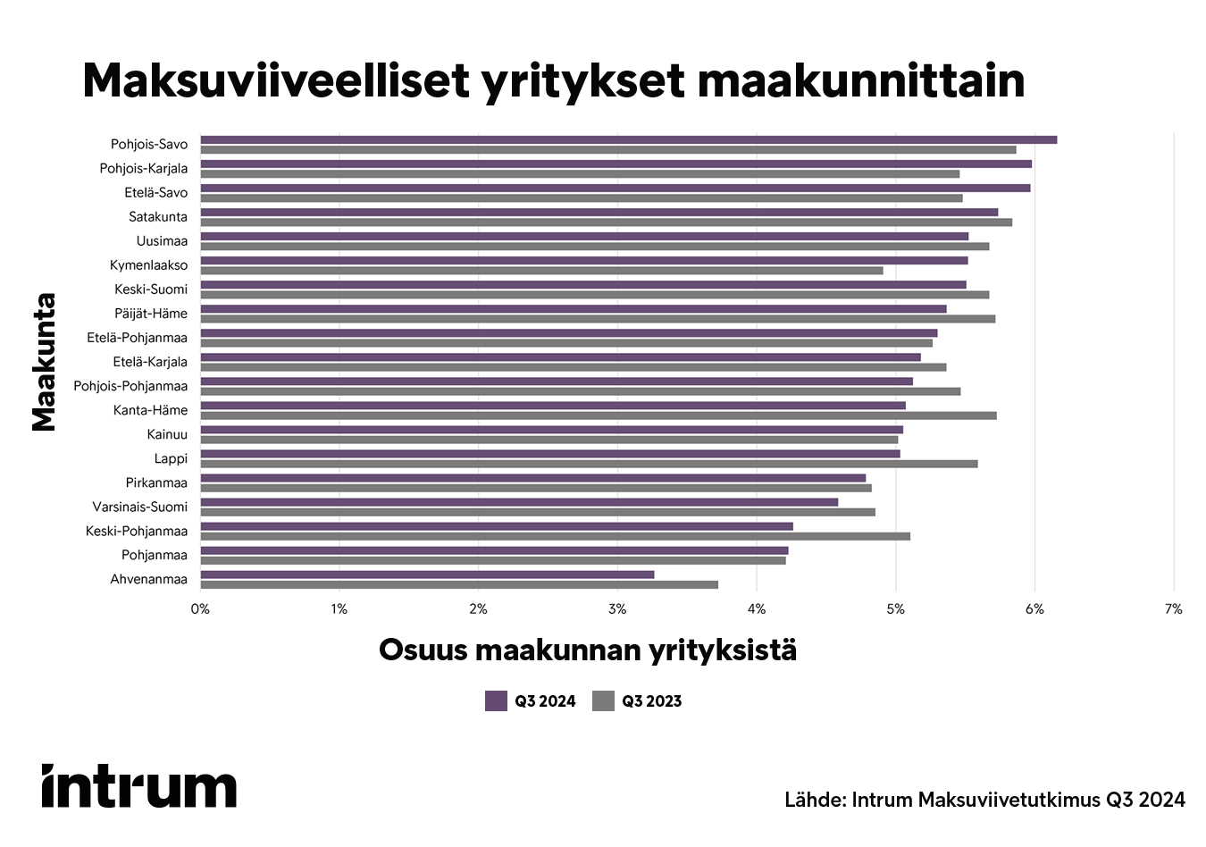 Intrumin maksuviivetutkimus vuoden 2024 kolmannelta neljännekseltä kertoo, että maksuviiveellisten yritysten suhteellinen osuus on laskenut 2,38 prosentilla vuoden takaiseen verrattuna ja säilynyt samalla tasolla toiseen vuosineljännekseen verrattuna. Maksuviiveitä oli 18 408 yrityksellä, mikä on yli viisi prosenttia Suomen yrityksistä. Maksuviiveellisten yritysten määrän lasku vuoden takaiseen verrattuna selittynee talouden yleisen aktiivisuuden laskuna. Korkotaso on laskenut selvästi kolmannen vuosineljänneksen aikana, mutta se ei vielä näy yritysten toiminnassa.