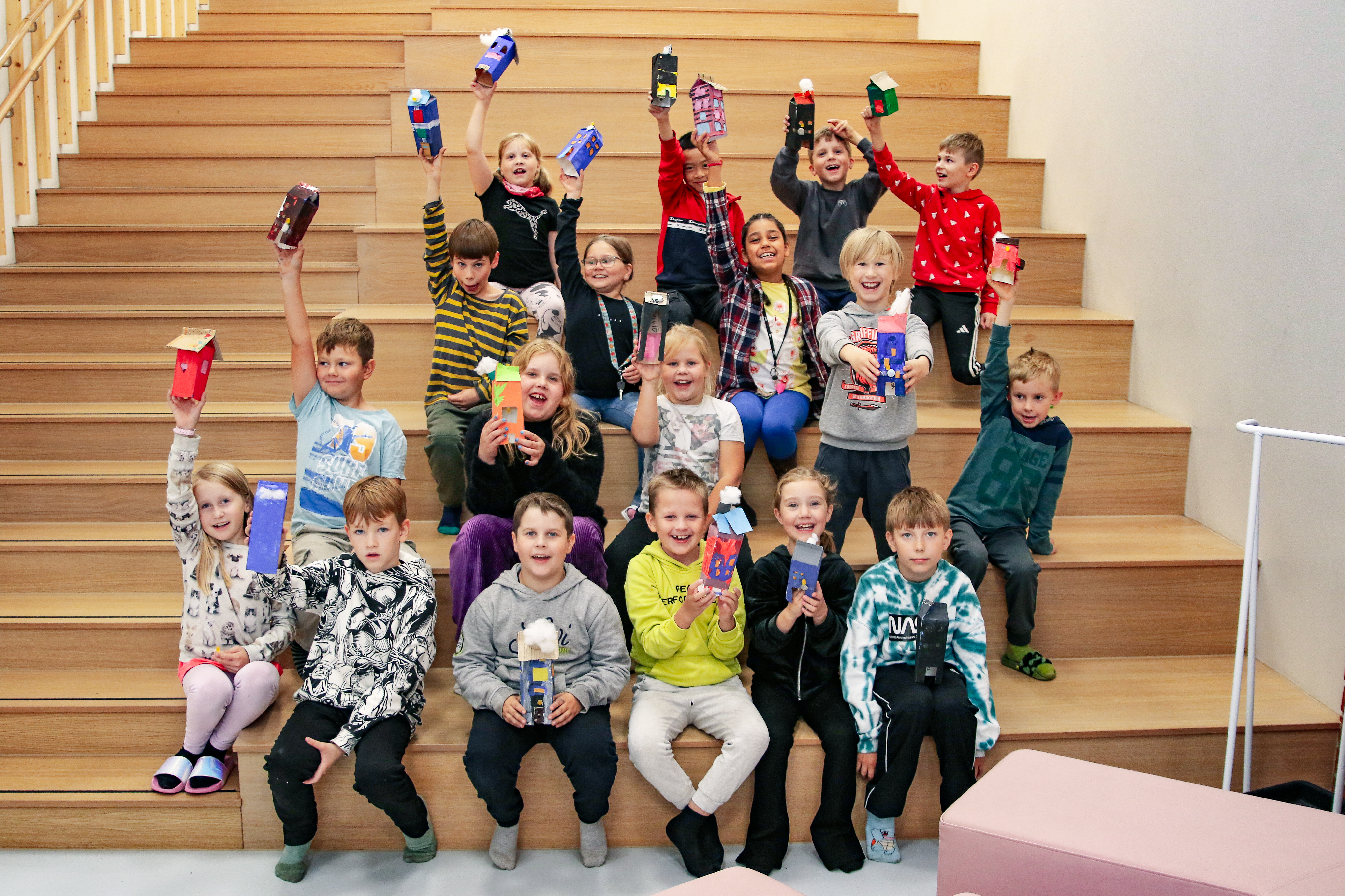 Jokainen oppilas teki oman maitopurkkitalon, joihin asennettiin led-valaistus. Tämän jälkeen lapset rakensivat ryhmissä pienet kaupungit, joissa on kierrätyskeskus.