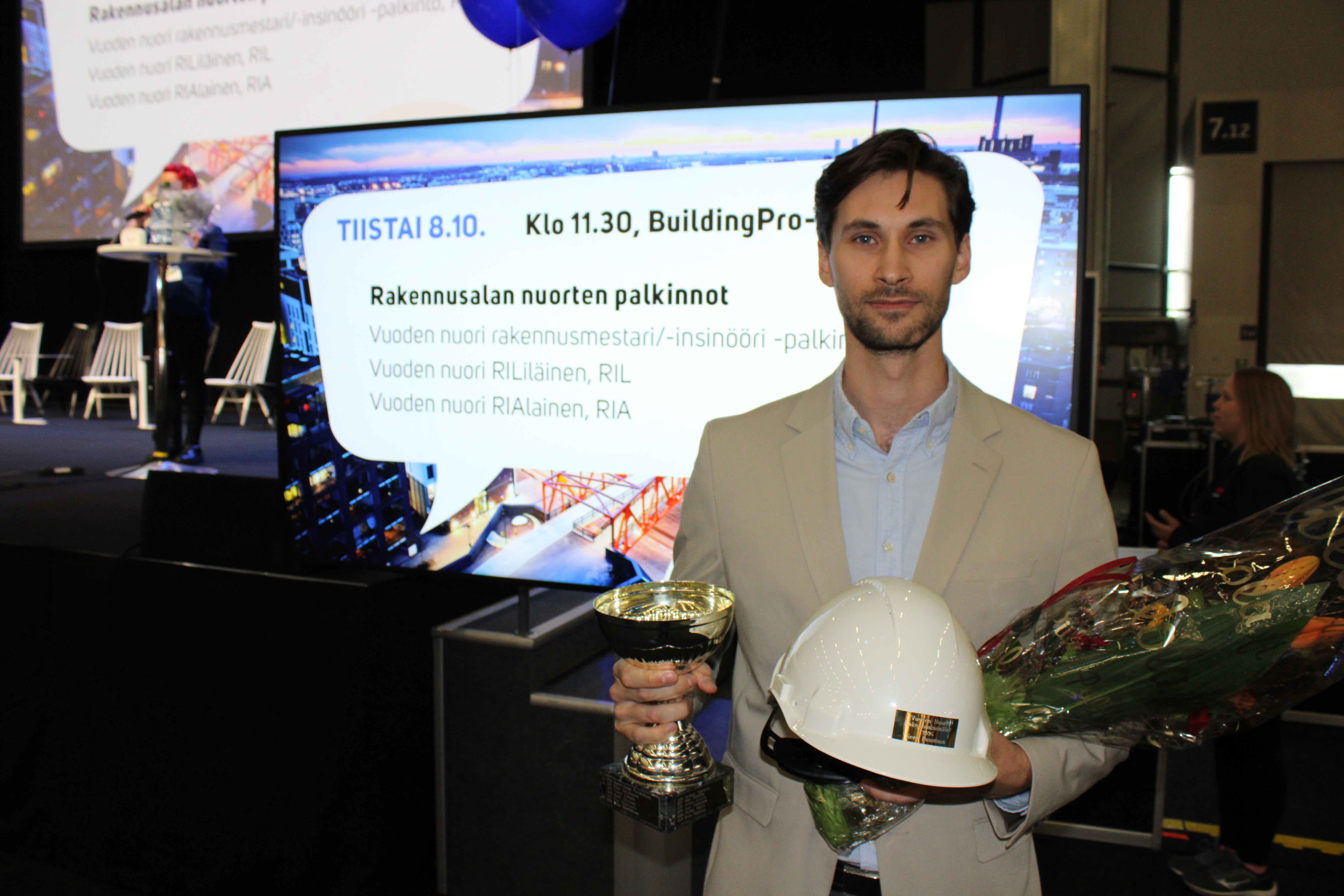Kiertävän pokaalin ja voittajan kypärän ojensi Puustiselle Finnbuild-messuilla Rakennusmestarien Säätiön Ari Autio ja RKL ry:n toimitusjohtaja Maria-Elena Ehrnrooth.