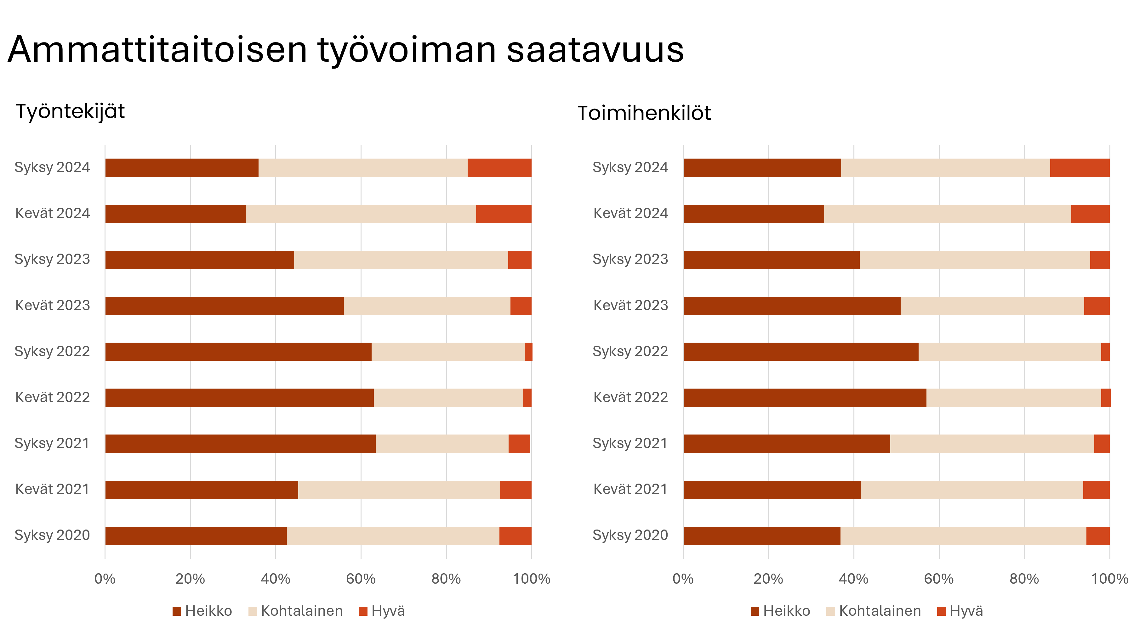 Henkilöstön määrän odotetaan vähenevän 1,2 prosenttia kevääseen mennessä. Lomautettuna on 2,8 prosenttia henkilöstöstä. Ammattitaitoisten tekijöiden saatavuus on hieman heikentynyt keväästä, vaikka edelleen seitsemän vastaajaa kymmenestä näkee ammattitaitoisten tekijöiden saatavuuden vähintään kohtalaisena.