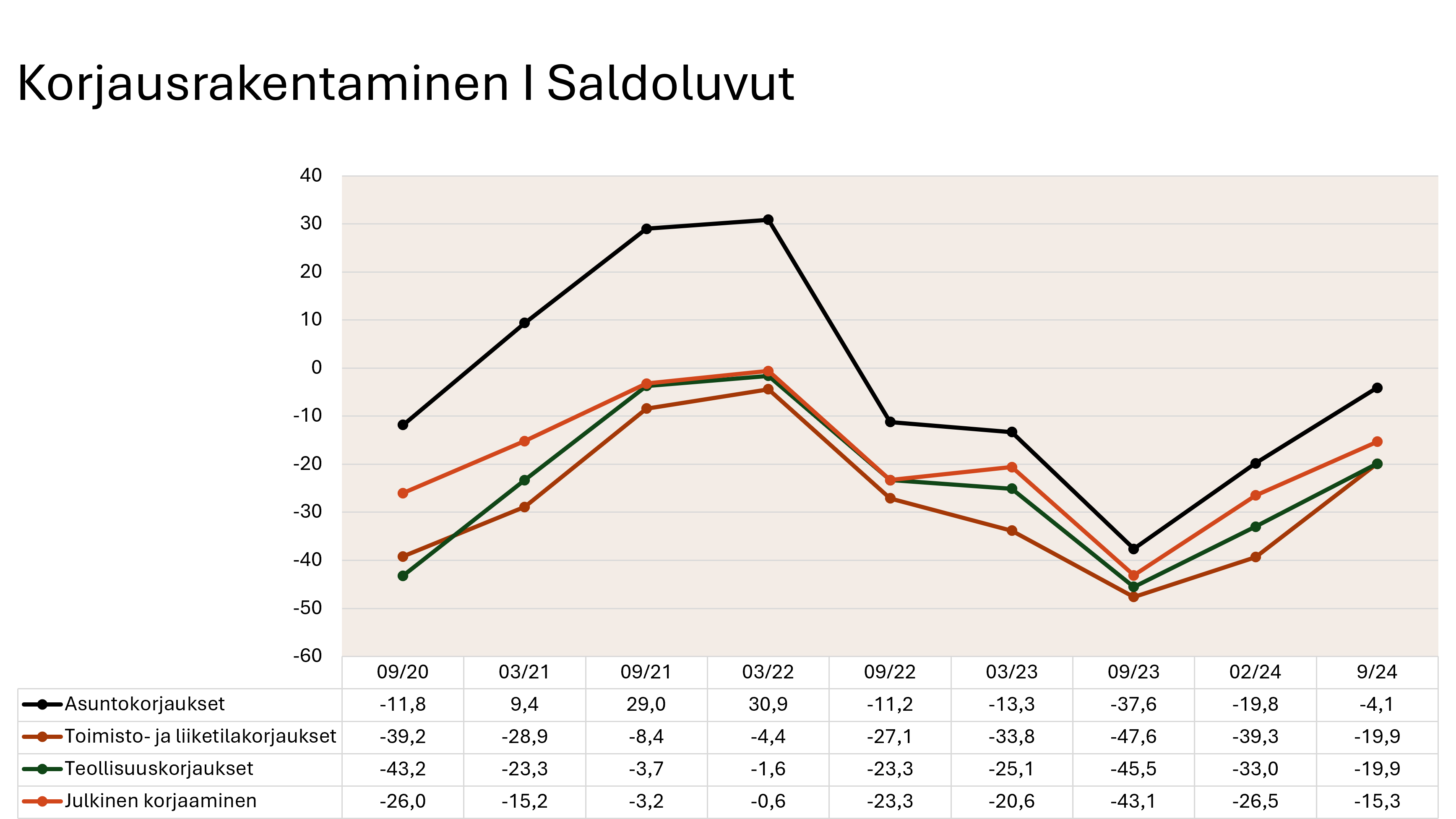 Korjausrakentamisen odotetaan edelleen vähentyvän kaikilla osa-alueilla, mutta saldoluvuilla mitattuna tilanne on hieman parantunut keväästä. Saldoluvun keskiarvo oli syksyllä -14,8, kun keväällä vastaava arvo oli -29,7. Eniten näkymä on kirkastunut asuntojen korjausrakentamisen osalta.