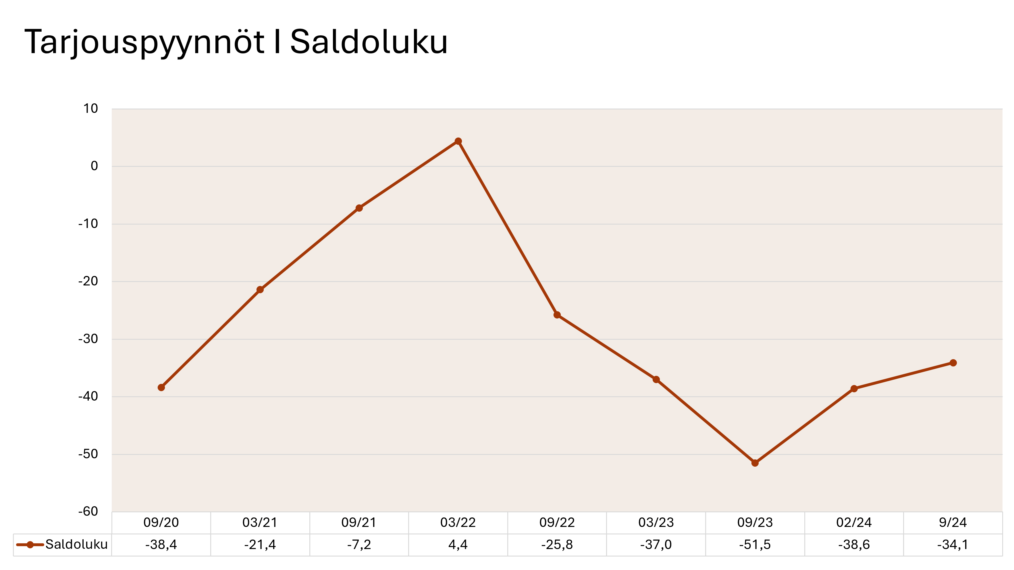 Tarjouspyynnöt ovat vähentyneet kautta linjan, mutta keväällä nähty pieni positiivinen kehitys jatkuu: muutos on nyt -34,1 verrattuna kevään arvoon -38,6. Alueellinen vaihtelu on suurta, ja positiivisin tilanne on Pohjois-Savossa, Kanta-Hämeessä ja Varsinais-Suomessa. Kokoluokittain katsottuna pienemmillä yrityksillä noin joka neljäs tarjous johti kauppaan, kun isoilla suhde oli yksi kymmenestä.
