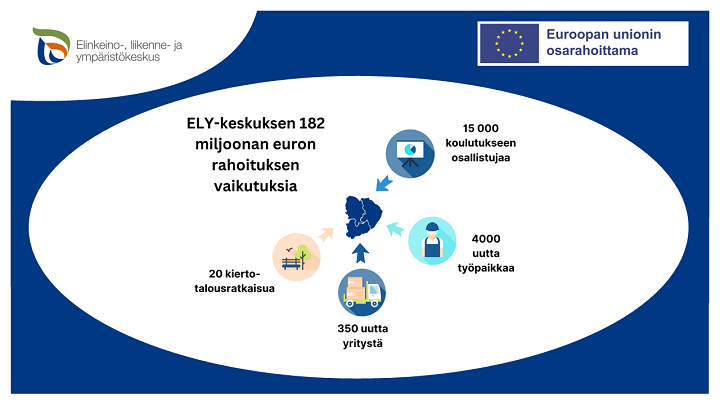Vuoden 2024 tammi-elokuun aikana ELY-keskus rahoitti 65 ESR+ hanketta yhteensä 20 miljoonalla eurolla. Oikeudenmukaisen siirtymän (JTF) hankkeita rahoitettiin 5 kappaletta yhteensä 1,3 miljoonalla eurolla.