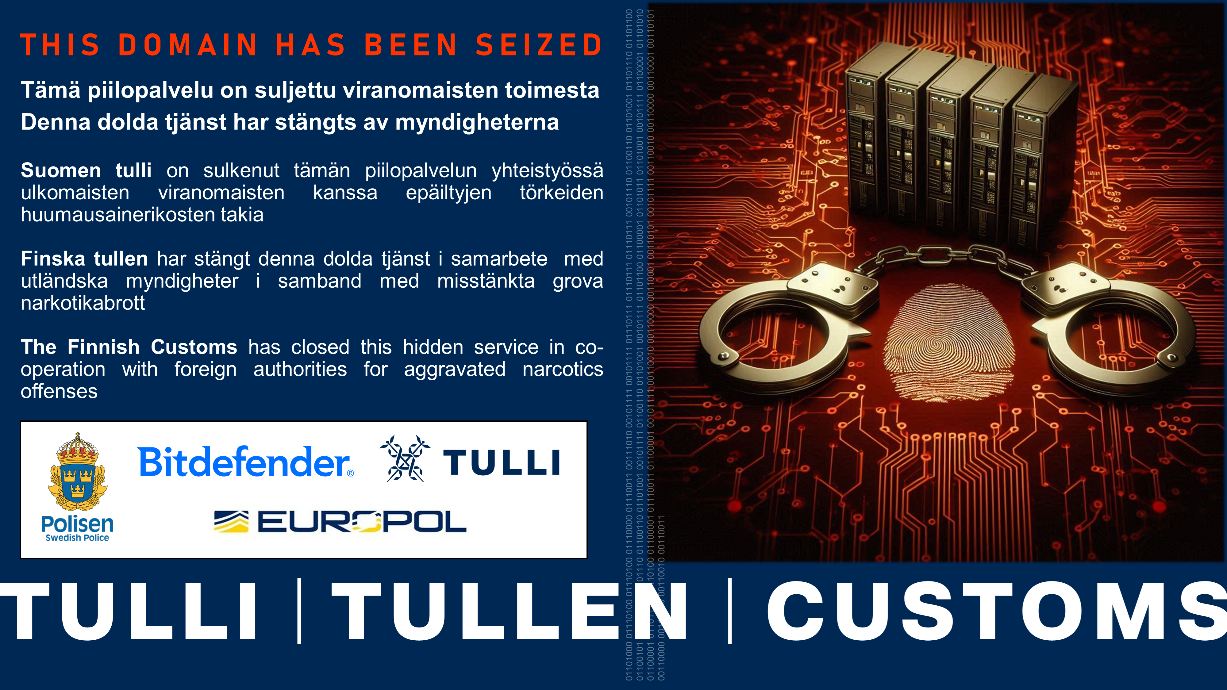 Suomen tulli on sulkenut yhteistyössä Ruotsin poliisin kanssa Tor-verkossa vuodesta 2023 toimineen Sipulitie-kauppapaikan verkkopalvelimia ja takavarikoinut niiden sisällön. Sivustoa käytettiin rikollisiin tarkoituksiin, kuten huumausaineiden myymiseen anonyymisti.