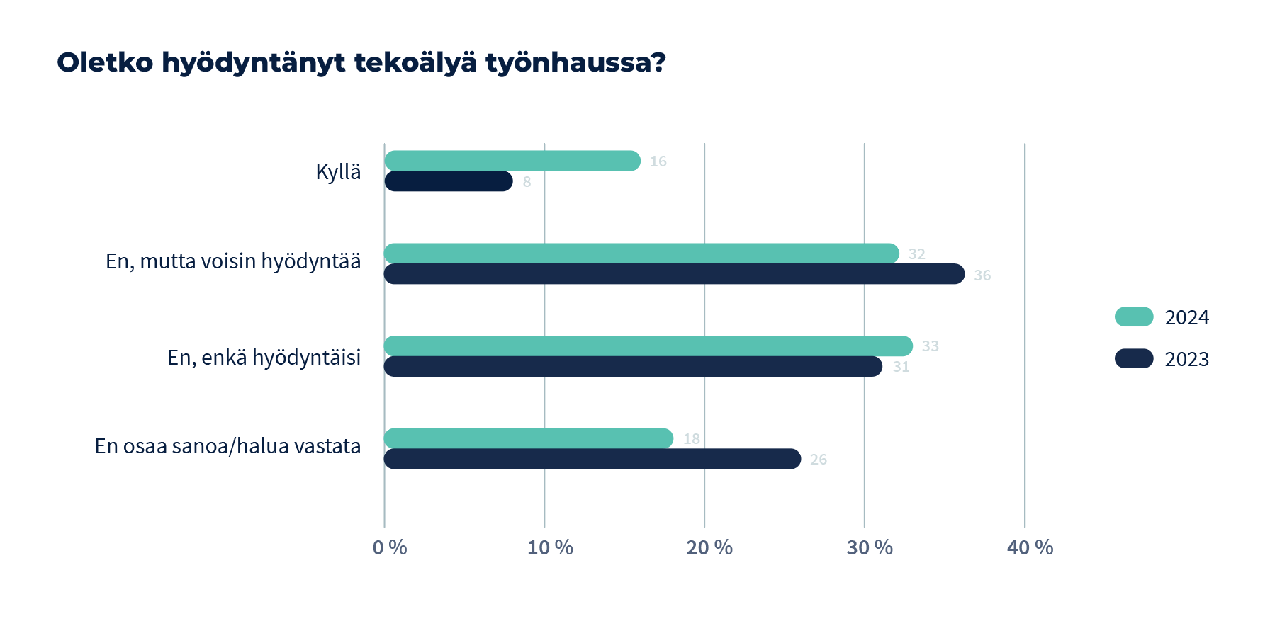 32 prosenttia vastaajista, jotka eivät ole hyödyntäneet tekoälyä, voisi käyttää sitä tulevaisuudessa. Kolmannes vastaajista ei kuitenkaan hyödyntäisi tekoälyä lainkaan.