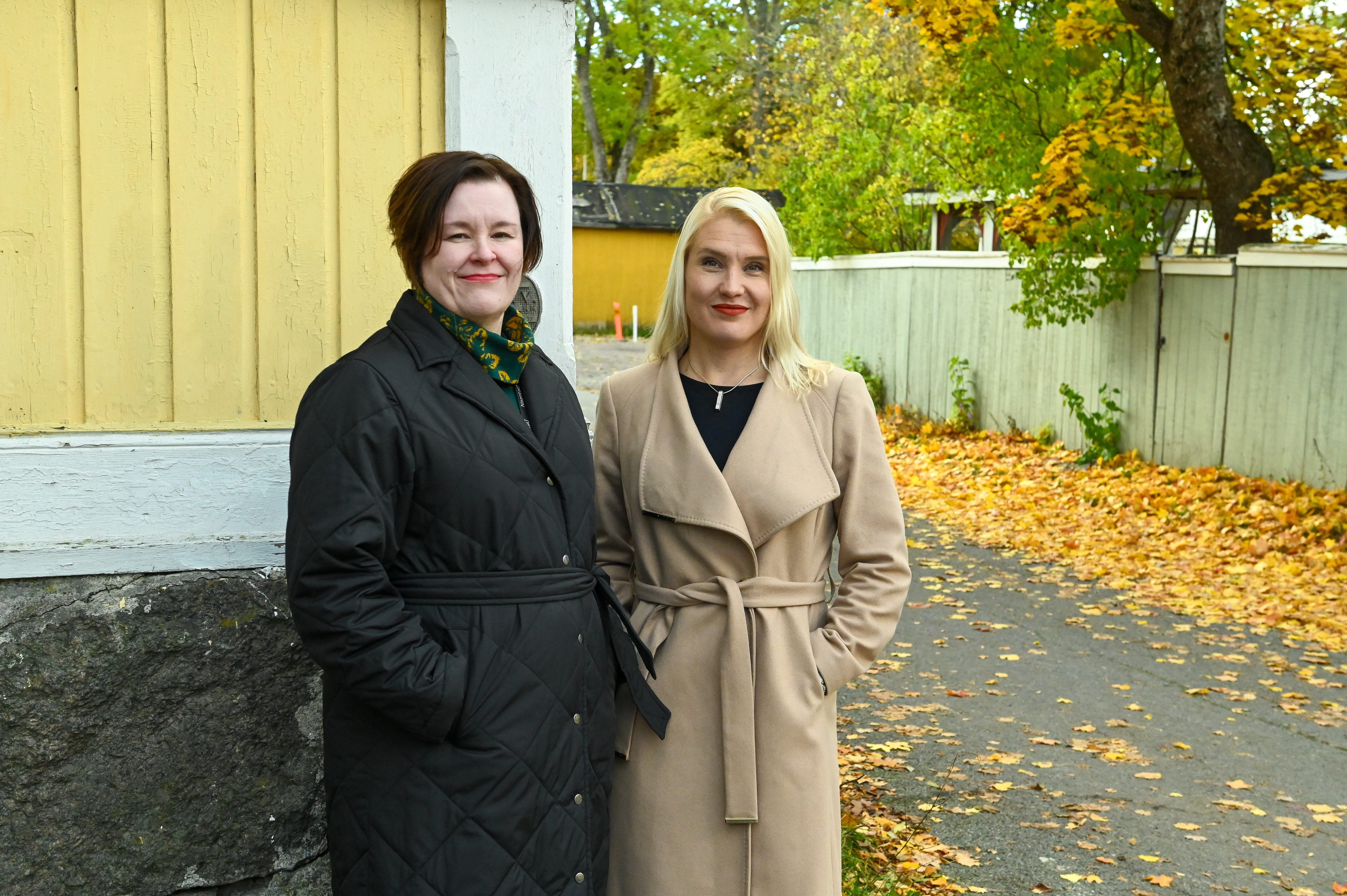 Heli Lähteenmäki ja Laura Leppänen seisovat Naantalin keskustan kadulla puutalon edessä.