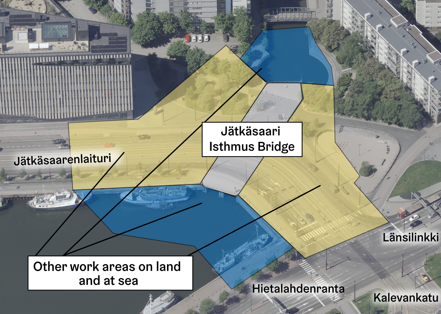 The old bridge on the Jätkäsaari isthmus is being renovated. Tram traffic and motor vehicles will be able to pass through the construction site during the renovation. Initially, the work will only affect the pedestrian and cyclist routes. Next year, the work will also have an impact on the roadway.