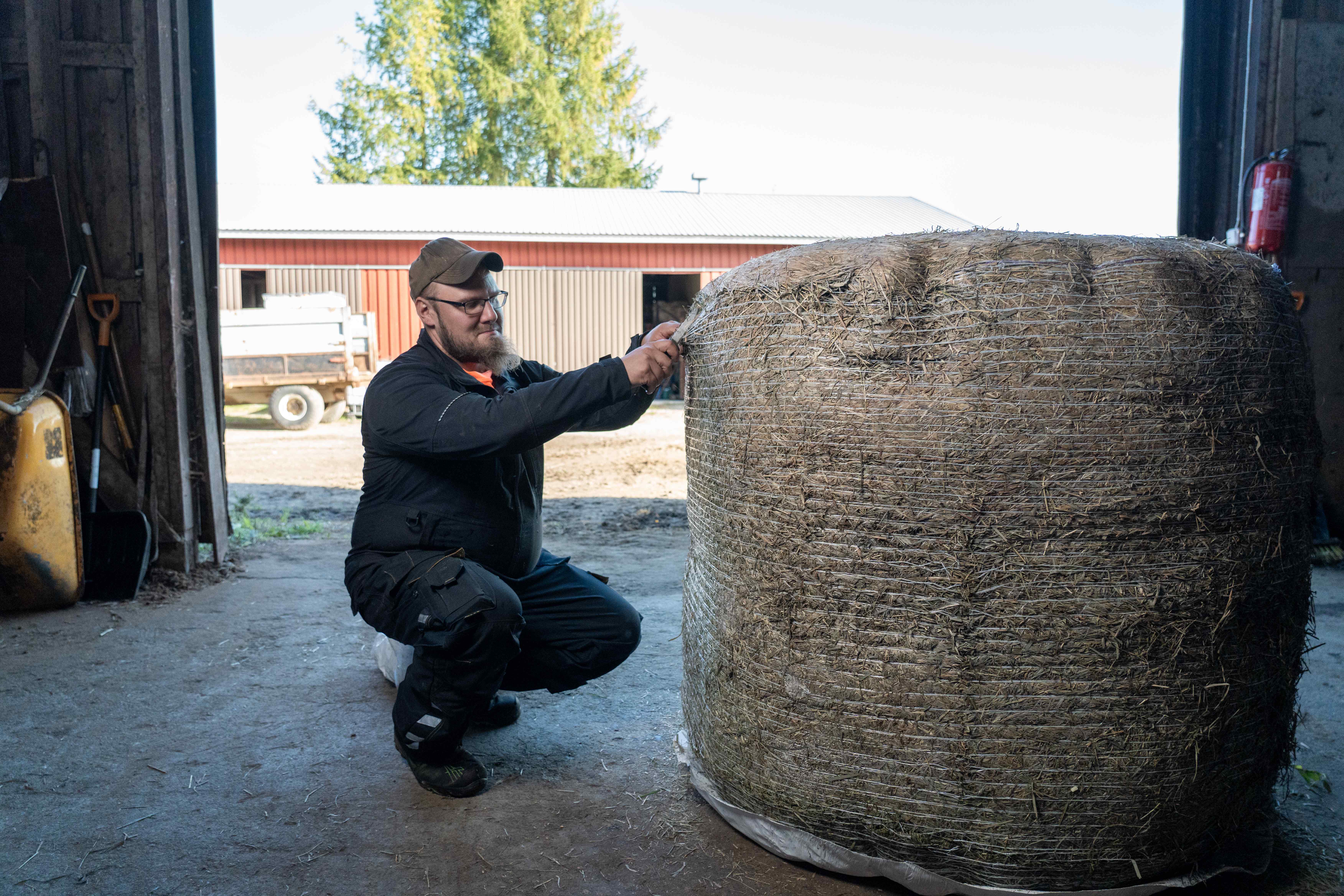 Haalaripukuinen mies kyykistyneenä rehupaalin viereen maatilarakennuksessa.