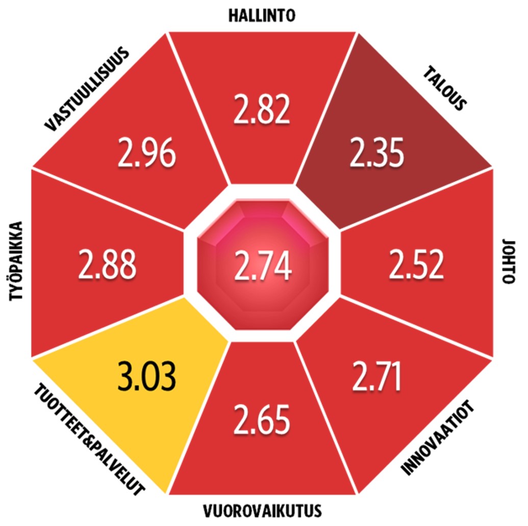 Maineen kahdeksasta osa-alueesta talouden ja johtamisen osa-alueet taasen laskivat keskiarvollisesti eniten.