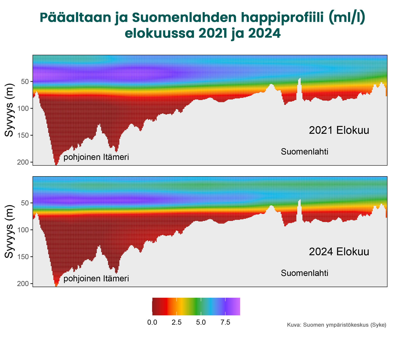 The oxygen situation in the deep waters of the open Gulf of Finland remains poor (Figure 2). This increases the amount of nutrients that cause eutrophication, as phosphorus reserves in the bottom sediments are released, increasing the amount of phosphate phosphorus in the bottom waters.