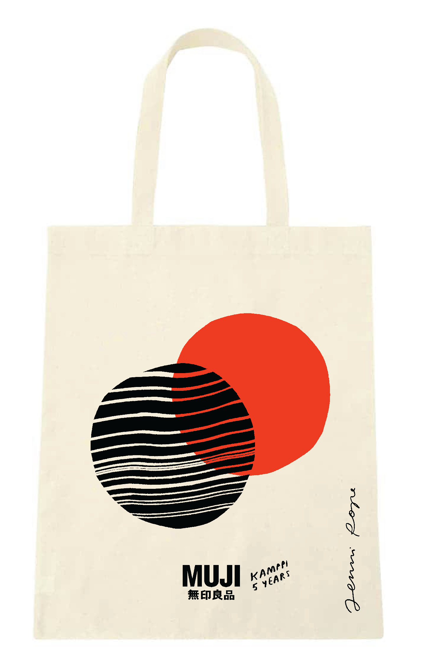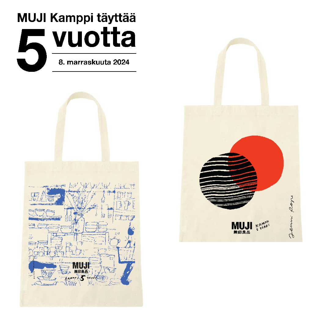 Jo viisi vuotta suomalaisia Helsingin keskustassa palvellut MUJI Kamppi juhlistaa merkkipäiväänsä yhteistyöllä suomalaistaiteilijoiden Matti Pikkujämsän ja Jenni Ropen kanssa. Taiteilijat ovat suunnitelleet juhlan kunniaksi erikoiskassit, jotka ilmentävät MUJIn yksinkertaista ja ajatonta tyyliä. MUJI Kamppi on viiden vuoden ajan tuonut suomalaisten arkeen käytännöllisyyttä ja tukenut paikallisia tekijöitä osana yhteisöään.